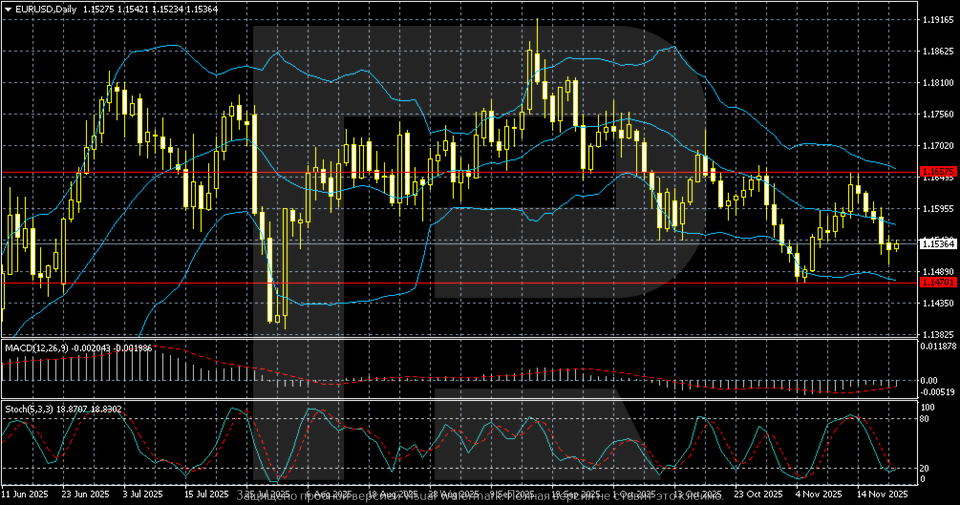 The EURUSD pair will likely remain within a neutral range during 24–28 November, reflecting market caution ahead of the Fed’s December meeting. Uncertainty due to delayed macroeconomic reports and the absence of clear signals from the Fed and ECB prevents the pair from forming a sustainable bullish impulse.