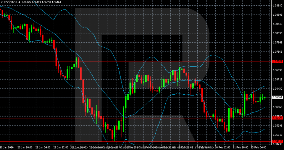 On the H4 chart, the USDCAD pair remains in a consolidation phase after January’s decline. The pair is trading in the middle of a broad range between 1.3490 and 1.3725, currently around 1.3615. There is no clear trend: Bollinger Bands have flattened, and volatility is moderate.