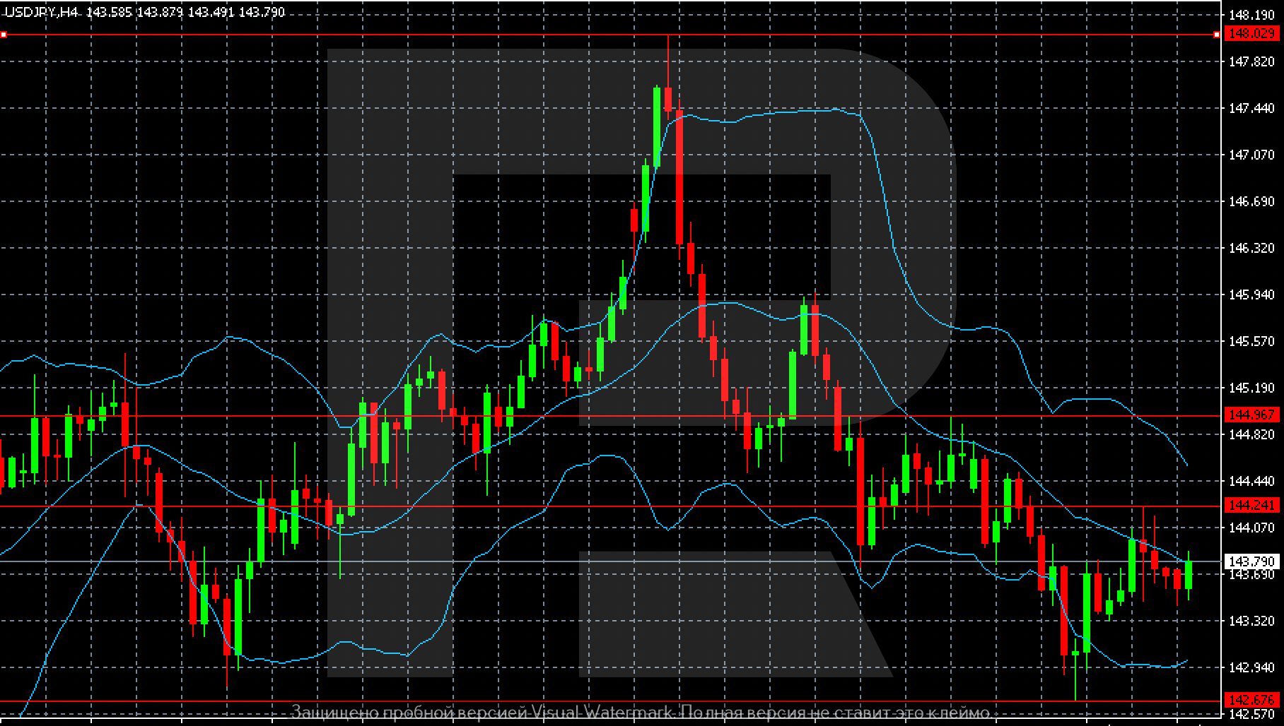 On the H4 chart for USDJPY, the price reversed downwards and entered a correction after rising to the 148.03 high. The minimum decline was recorded around 142.67, from where a moderate rebound began. Currently, quotes have stabilised near 143.79 but remain below key resistance levels.