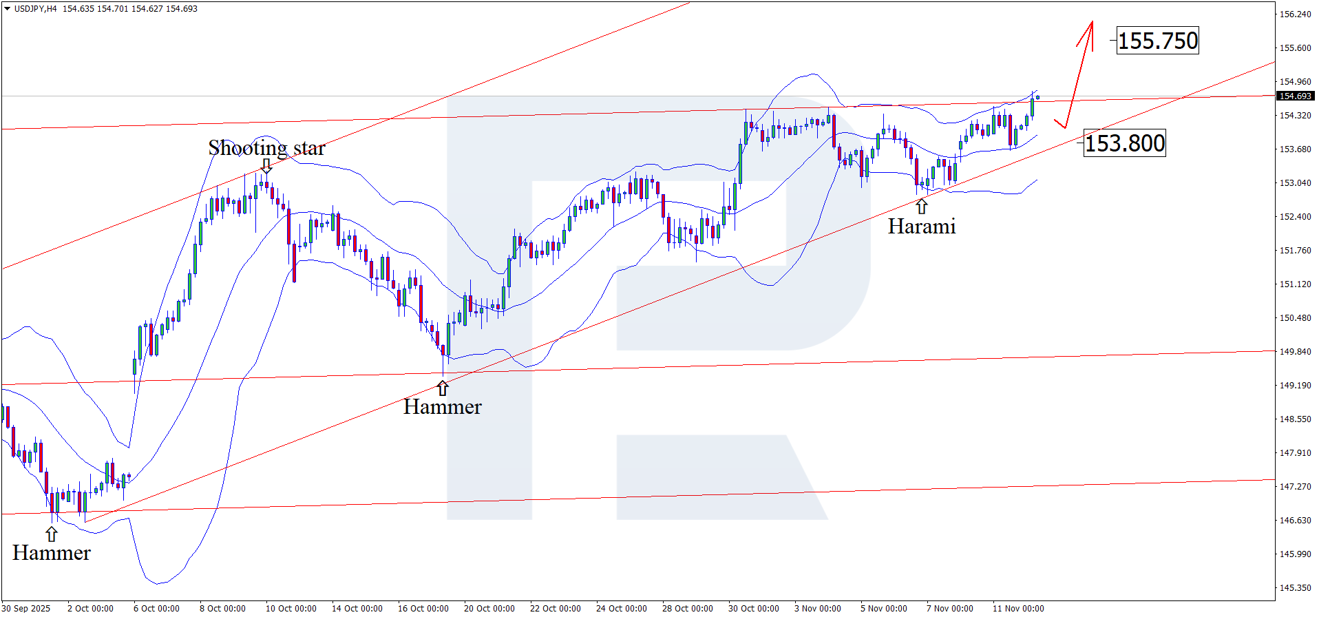 The forecast for 12 November 2025 shows that the USDJPY pair, having set another 2025 price record, continues its upward momentum and is trading around 154.60.