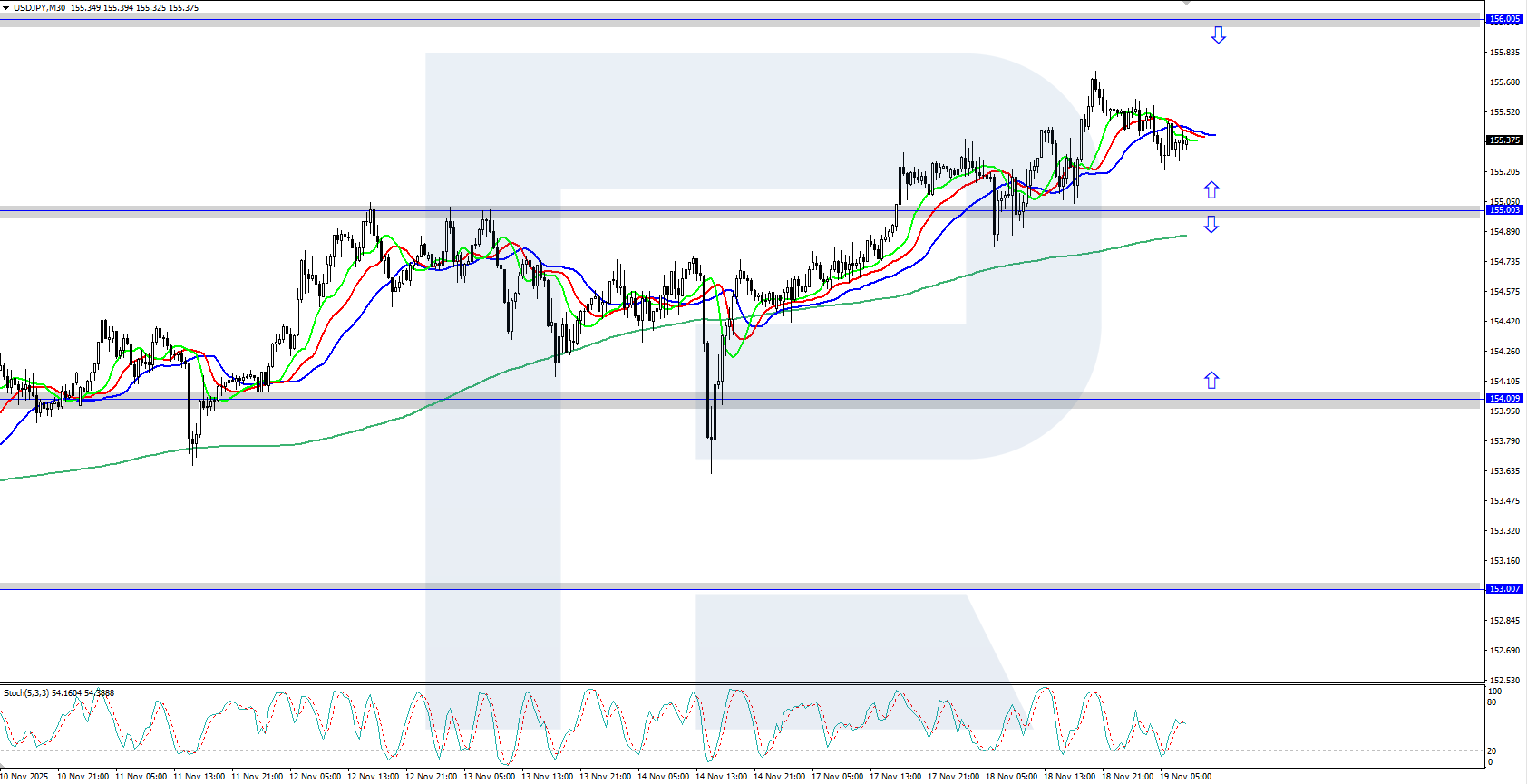 The USDJPY rate is rising, having consolidated above 155.00. Today, the market focuses on the minutes of the latest US Fed meeting. Find out more in our analysis for 19 November 2025.