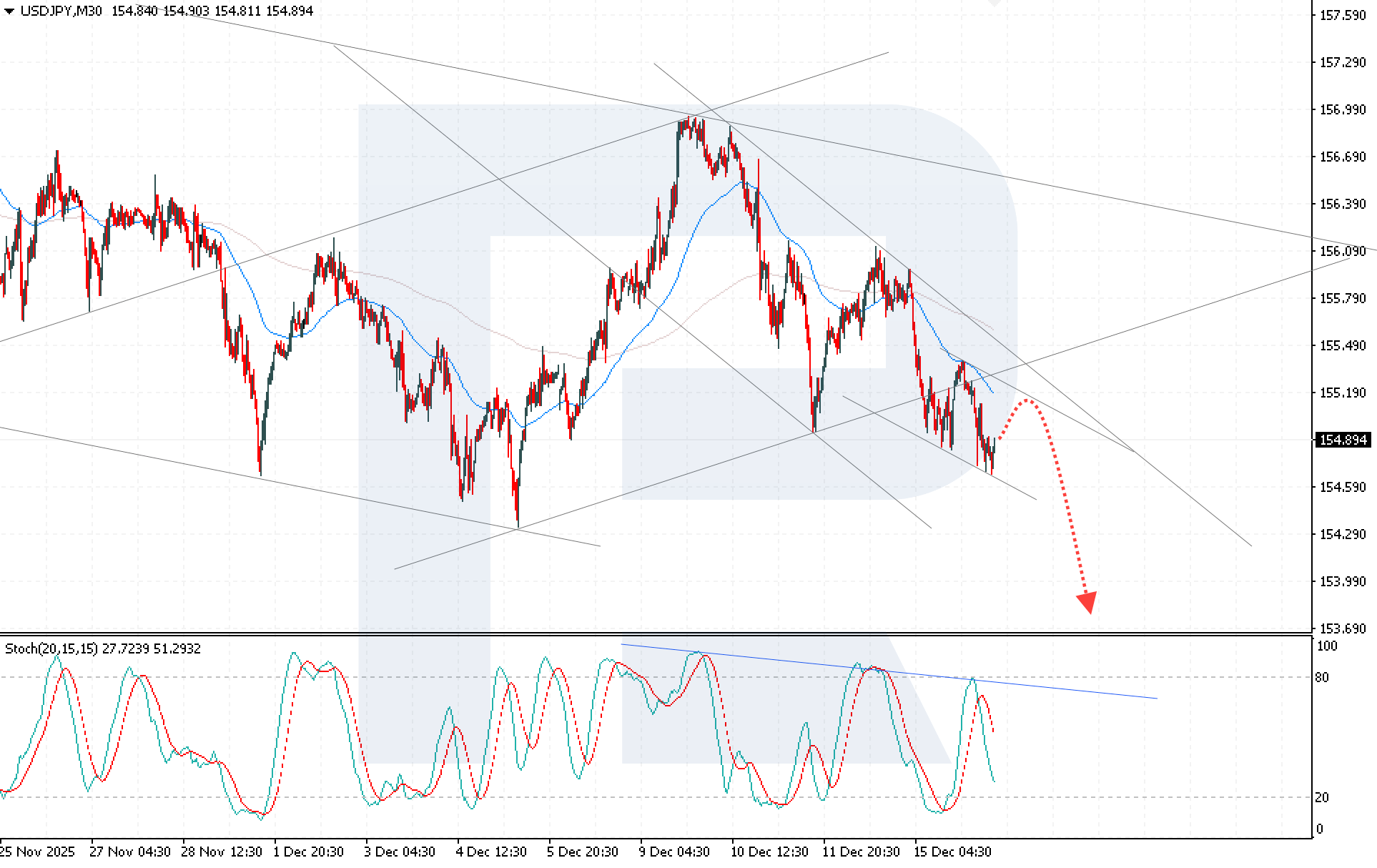 The USDJPY pair remains under pressure from fundamental factors and bearish technical signals. The current quote is 154.89. Details — in our analysis for 16 December 2025.