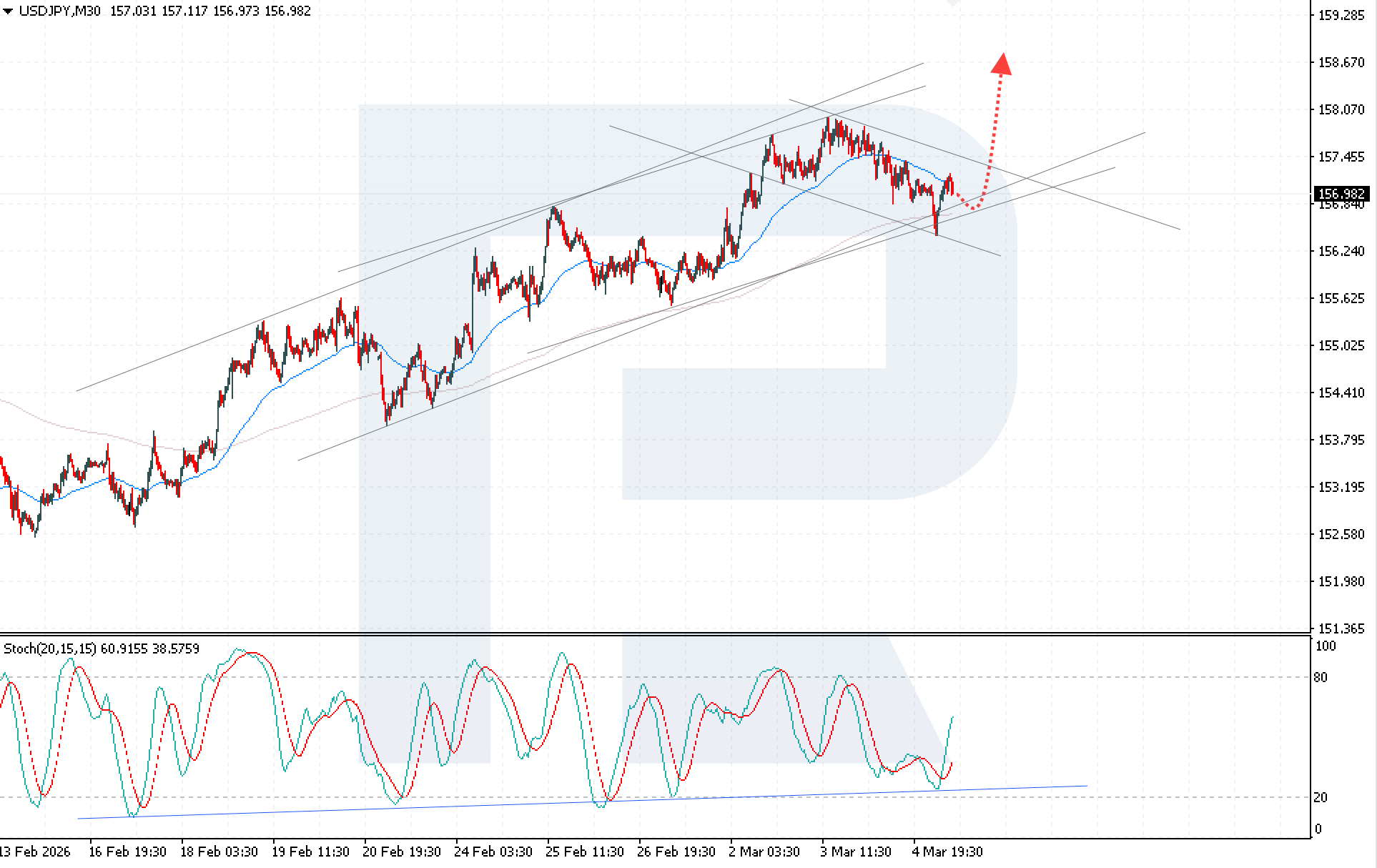 The USDJPY pair is recovering after rebounding from a key support level amid expectations of a dovish BoJ policy, with the rate currently standing at 156.98. Discover more in our analysis for 5 March 2026.