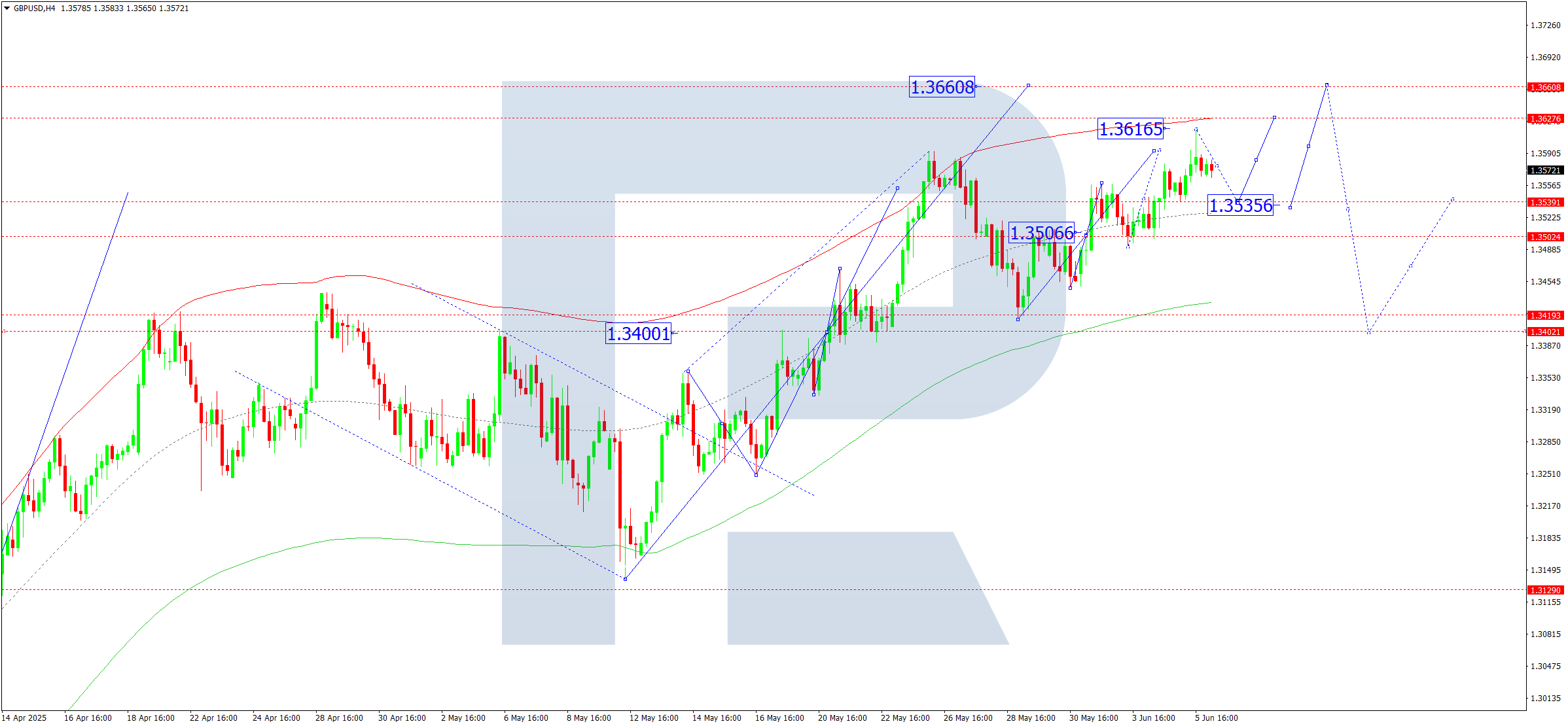 On the H4 chart of GBPUSD, the market reached 1.3616. Today, 6 June 2025, a pullback to 1.3535 is expected. The upward wave may then extend to 1.3626, with a possible continuation to 1.3660. After that, a drop to 1.3400 may follow.