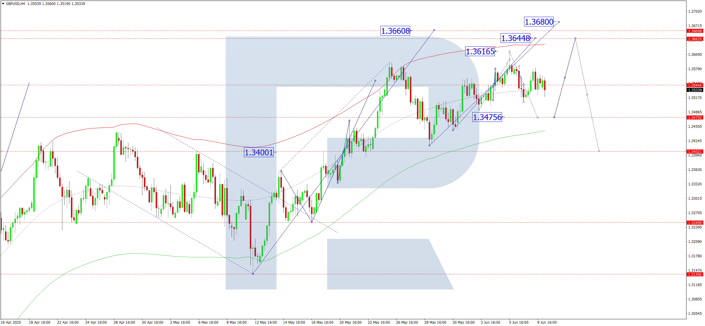 On the H4 chart, GBPUSD continues consolidating around 1.3544. Today, 10 June 2025, a downward movement to 1.3475 is anticipated, followed by a rise back to 1.3544. A downward breakout could trigger a move towards 1.3400. An upward breakout may extend the growth wave towards 1.3644.