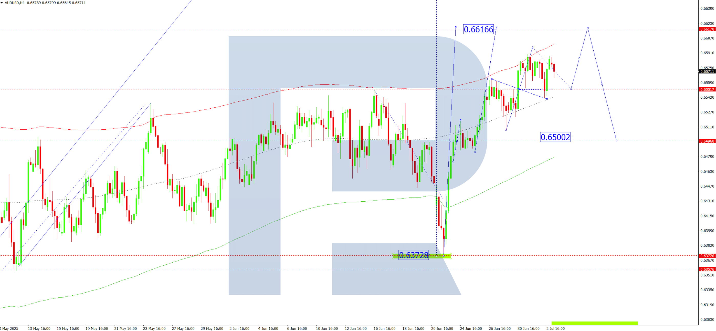 On the H4 chart of AUDUSD, the market continues developing a consolidation range around 0.6555. Today, 3 July 2025, a rise towards 0.6595 and a decline to 0.6535 are possible. If the market breaks upwards out of this range, continuation of the growth wave towards 0.6616 is relevant. Breaking downwards would open potential for a correction to 0.6500.