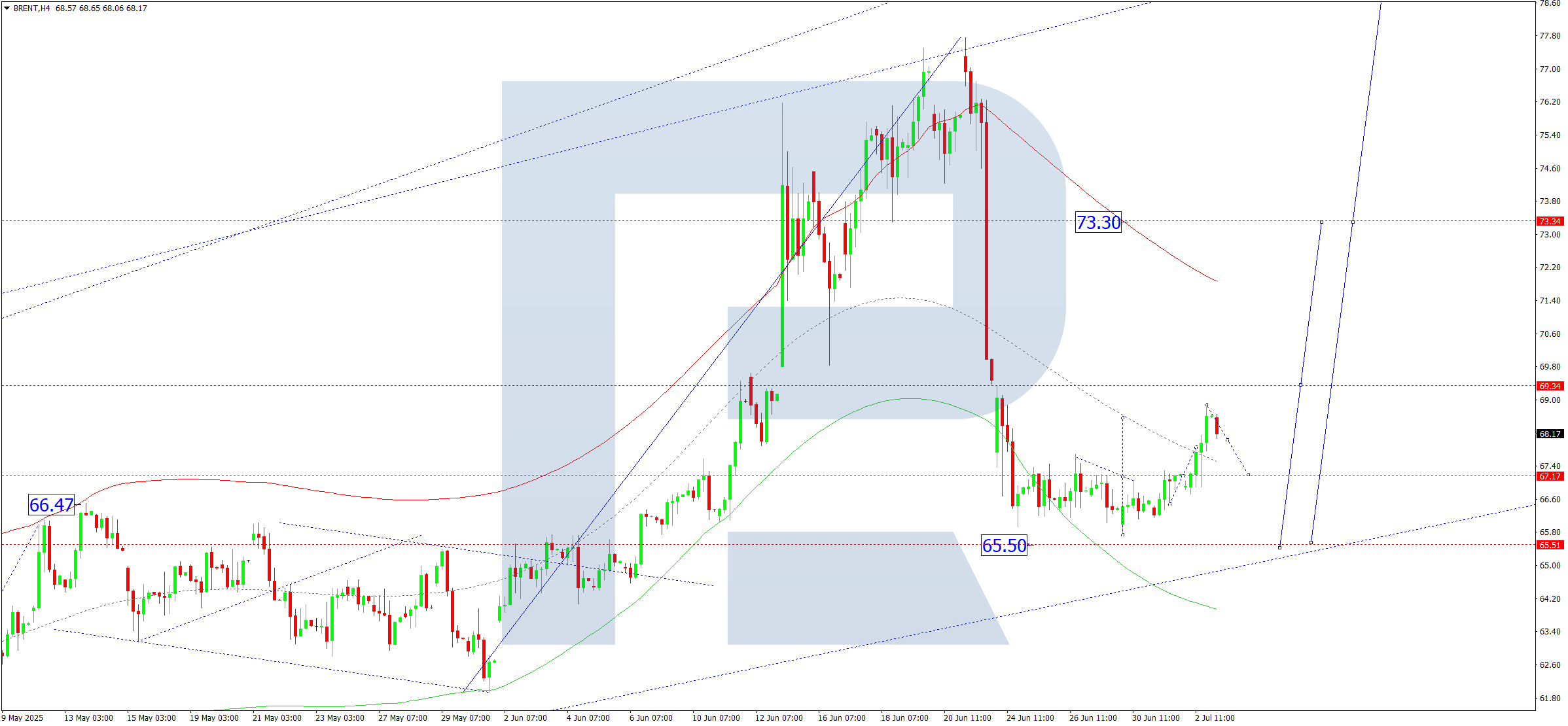 On the H4 chart of Brent crude, the market formed a consolidation range around 67.17 and broke upwards, completing a growth wave towards 68.92. Today, 3 July 2025, we expect a decline to 67.17 (testing from above). If the market breaks upwards out of this range, potential for a growth wave towards 73.30 opens. A break downwards would indicate continuation of the wave towards 65.50. Afterwards, growth towards 73.30 is anticipated.