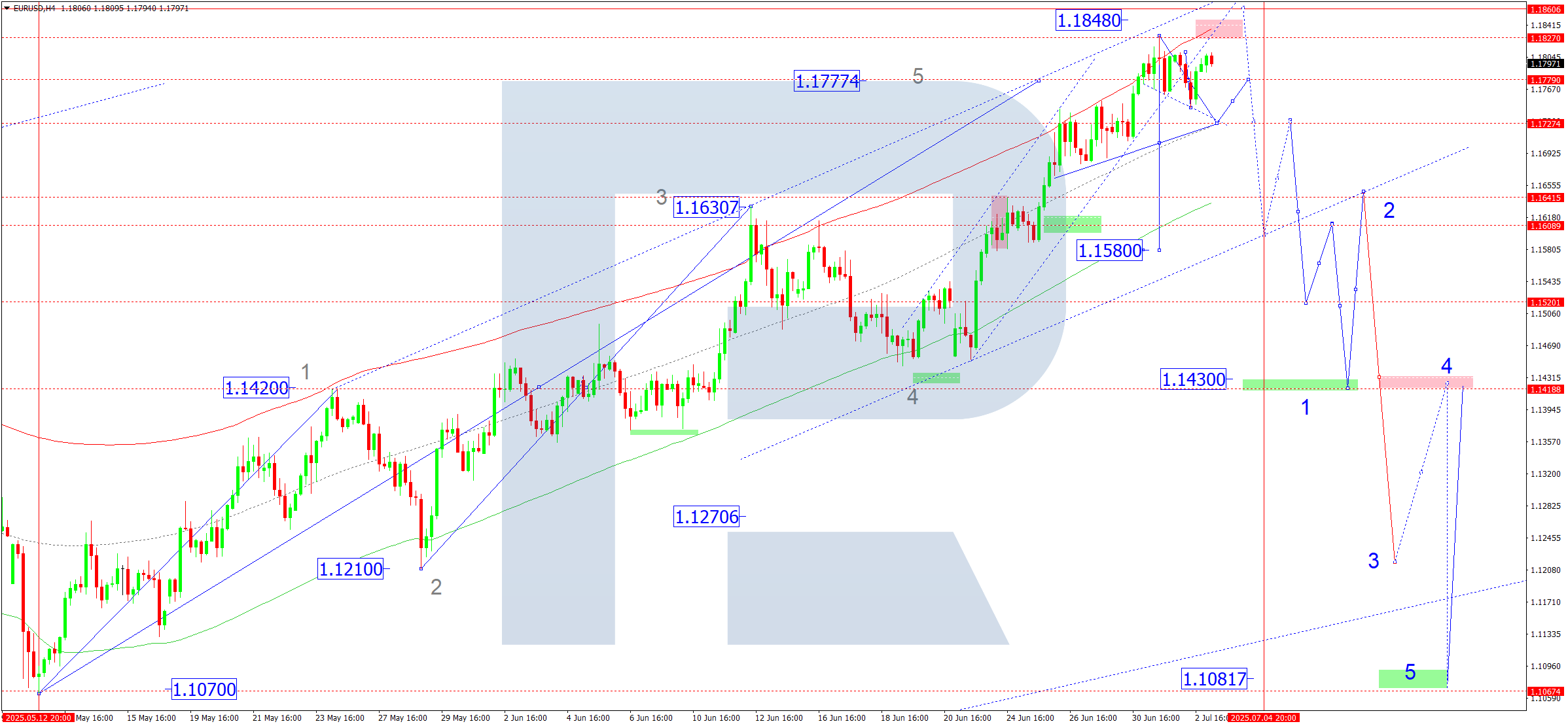 On the H4 chart of EURUSD, the market continues developing a consolidation range around 1.1777. Currently, the range has expanded down to 1.1746 and up to 1.1809. Today, 3 July 2025, we consider the possibility of a decline to 1.1727, followed by a rise to 1.1777. If the market breaks upwards out of this range, another growth wave towards 1.1848 is possible. A break downwards would open potential for a wave towards 1.1580.