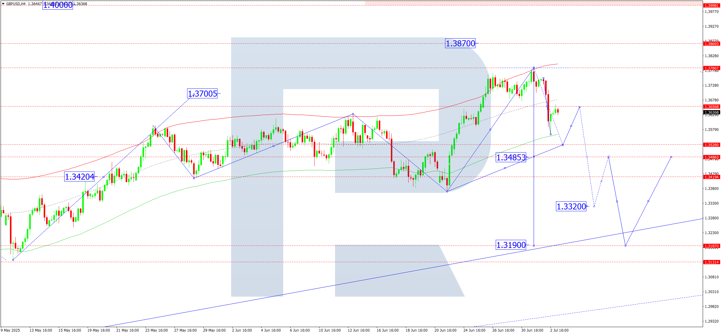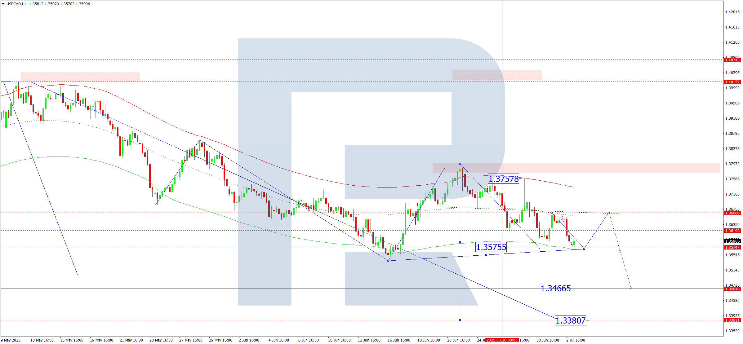 On the H4 chart of USDCAD, the market is forming a consolidation range around 1.3620. Today, 3 July 2025, we expect a decline to 1.3575. After reaching this level, a growth move back to 1.3666 (testing from below) is possible. Afterwards, another downward wave towards 1.3466 is anticipated, with trend continuation towards 1.3380.