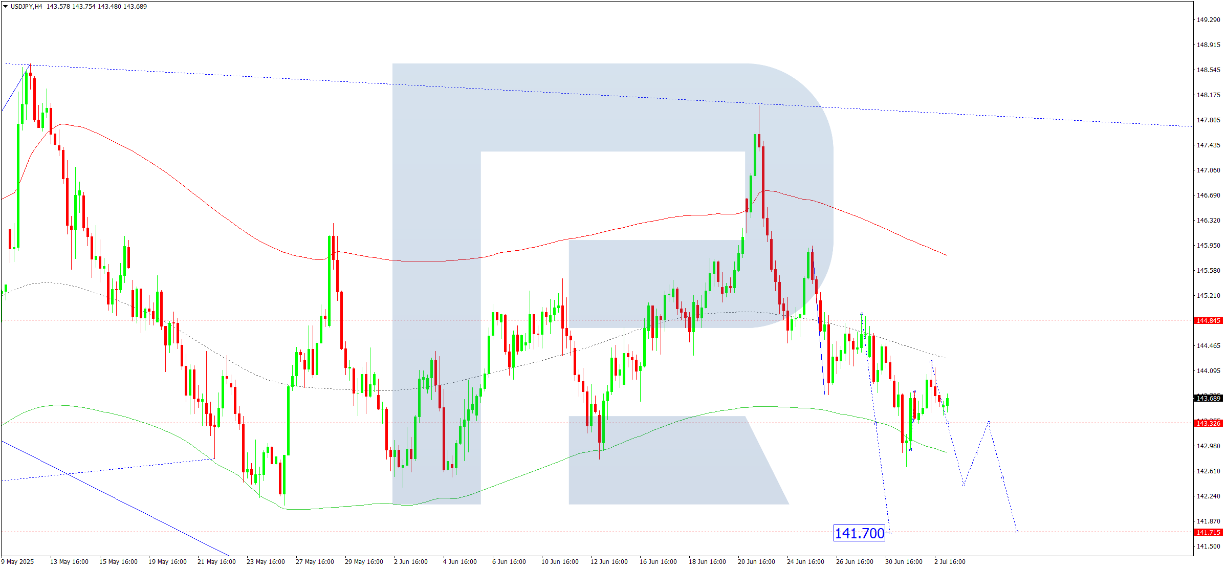 On the H4 chart of USDJPY, the market completed a growth wave to 144.23. Today, 3 July 2025, we will consider the possibility of a decline to 143.33. Breaking this level would open potential for a further downward wave towards 141.70. Afterwards, a corrective move back to 143.33 (testing from below) is possible.