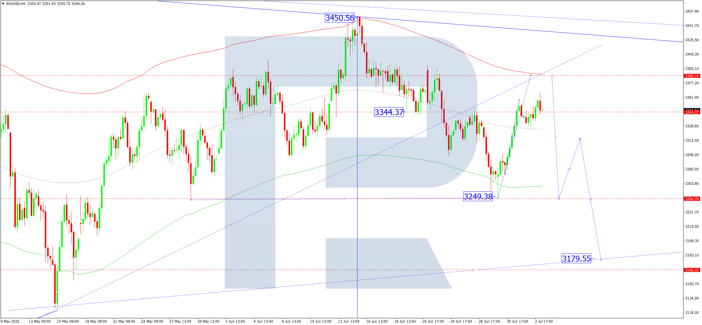 On the H4 chart of XAUUSD, the market is forming a consolidation range around 3344 without a clear trend. Today, 3 July 2025, if the market breaks upwards, a further correction to 3385 is possible. Afterwards, a downward wave towards 3250 is anticipated. A broad consolidation structure is forming around 3344.