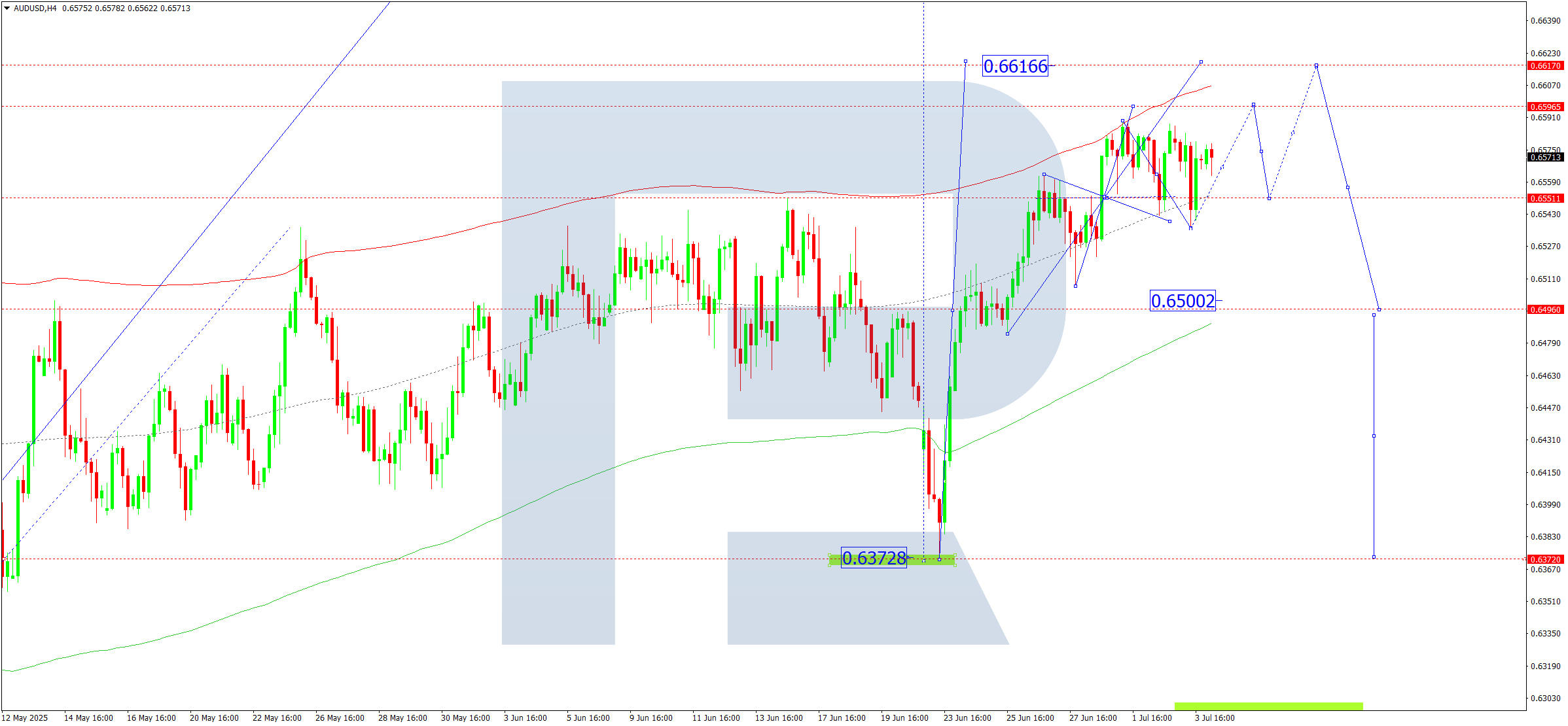 On the H4 chart of AUDUSD, the market completed a downward wave to 0.6537 and a growth wave to 0.6572. Today, 4 July 2025, a growth move to 0.6595 and a decline to 0.6535 are possible. If the market breaks upwards out of this range, continuation of the growth wave towards 0.6616 is relevant. A break downwards would open potential for a correction towards 0.6500.