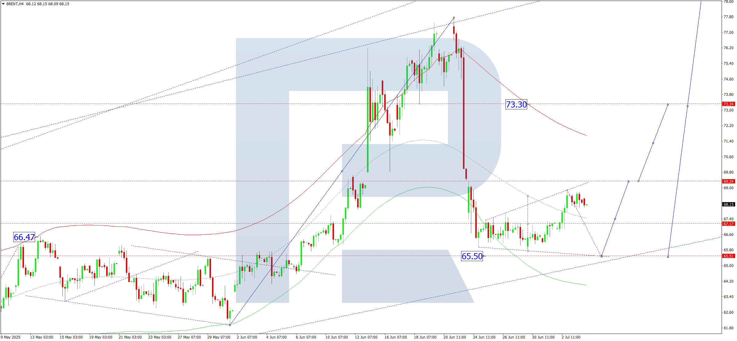 On the H4 chart of Brent crude, the market is forming a narrow consolidation range around 68.38. Today, 4 July 2025, if the market breaks downwards, a decline to 67.17 (testing from above) is expected. Breaking this level downwards would indicate continuation of the wave towards 65.50. A break upwards would indicate a growth wave towards 71.00, with potential continuation of the trend towards 73.30.