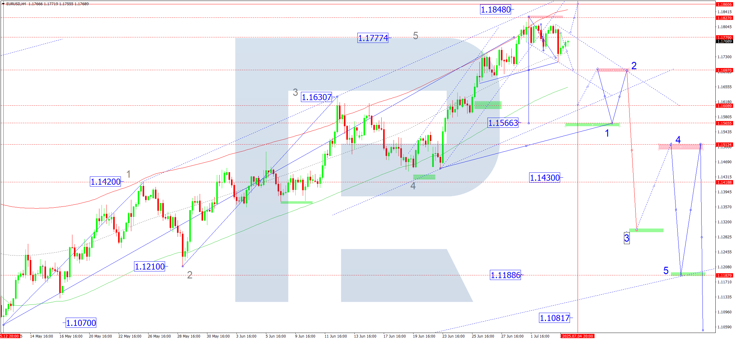 On the H4 chart of EURUSD, the market completed a downward wave to 1.1717 and corrected to 1.1788. The market has effectively defined the boundaries of a consolidation range around 1.1717. Today, 4 July 2025, if the market breaks upwards out of this range, another growth wave towards 1.1848 is possible. A break downwards would indicate continuation of the wave to 1.1566.