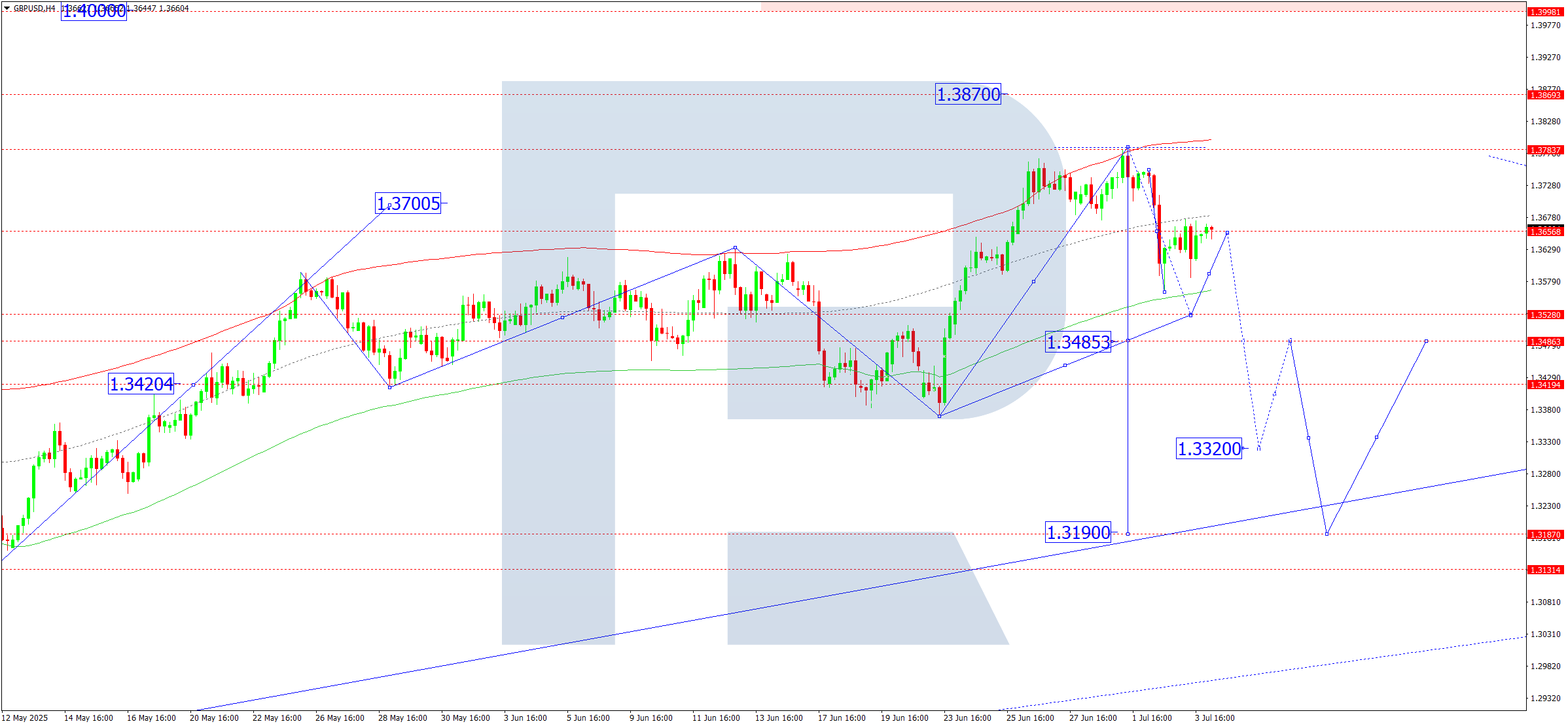On the H4 chart of GBPUSD, the market completed a decline to 1.3562 and a correction to 1.3674. Today, 4 July 2025, a decline to 1.3528 is not excluded. After reaching this level, a growth move back to 1.3656 (testing from below) is expected. This would define a broad consolidation range around 1.3656. Breaking upwards out of this range would open potential for a trend continuation towards 1.3870. A break downwards would indicate continued correction towards 1.3320.