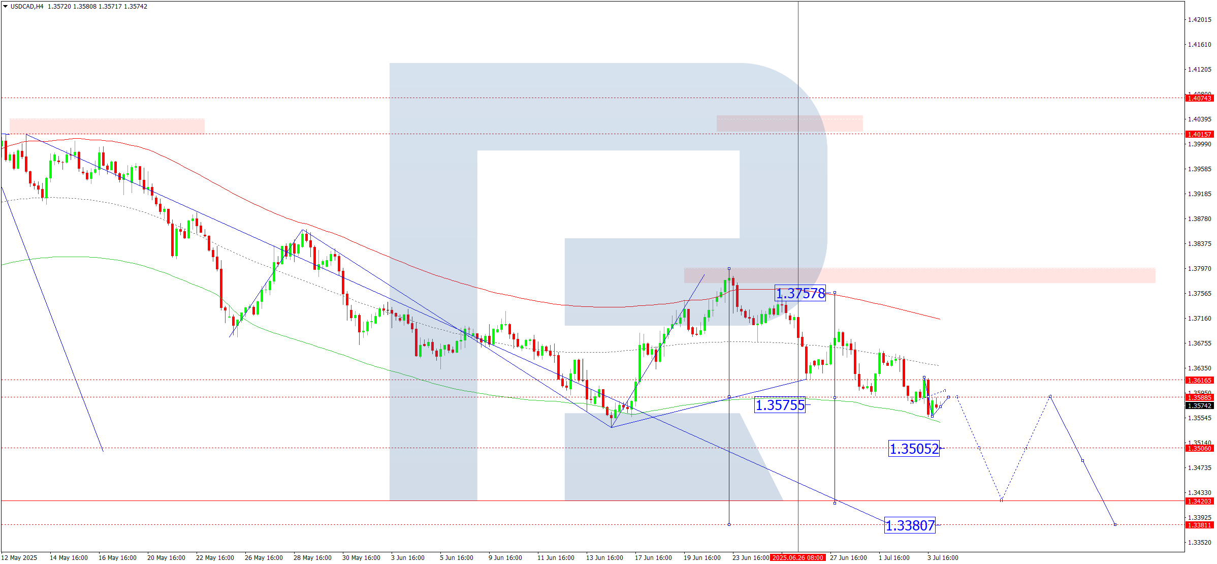 On the H4 chart of USDCAD, the market completed a downward wave to 1.3567 and is forming a consolidation range around 1.3588. Today, 4 July 2025, breaking downwards out of this range would open potential for continuation of the wave towards 1.3500. A break upwards would indicate the beginning of a growth wave towards 1.3757.