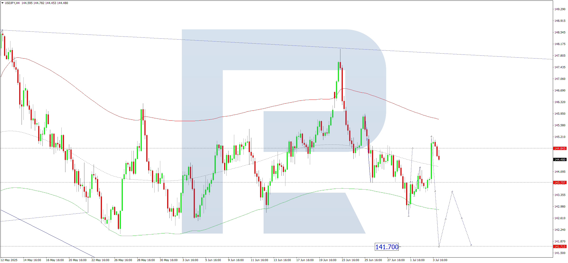 On the H4 chart of USDJPY, the market completed a correction wave to 145.22. Today, 4 July 2025, we consider the possibility of a decline to 143.73. Breaking this level would open potential for the wave to continue towards 141.70. Afterwards, a corrective move back to 143.73 (testing from below) is possible.