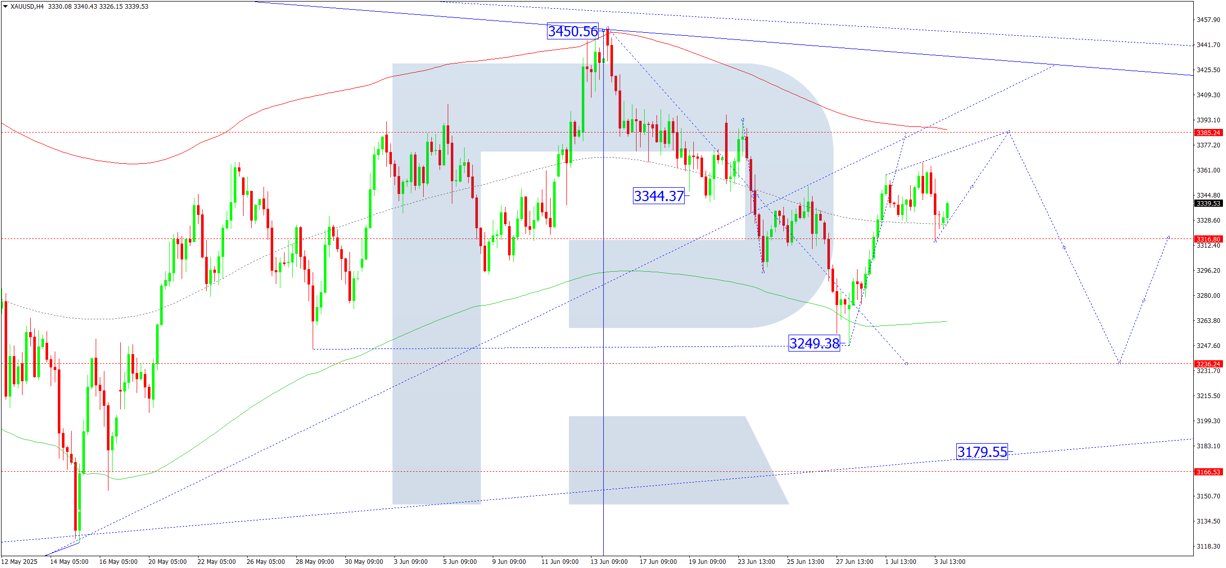 On the H4 chart of XAUUSD, the market is forming a consolidation range around 3344 without a clear trend. Today, 4 July 2025, if the market breaks upwards out of this range, continuation of the correction towards 3385 is possible. Afterwards, a downward wave towards 3250 is expected. A broad consolidation structure is forming around 3344.