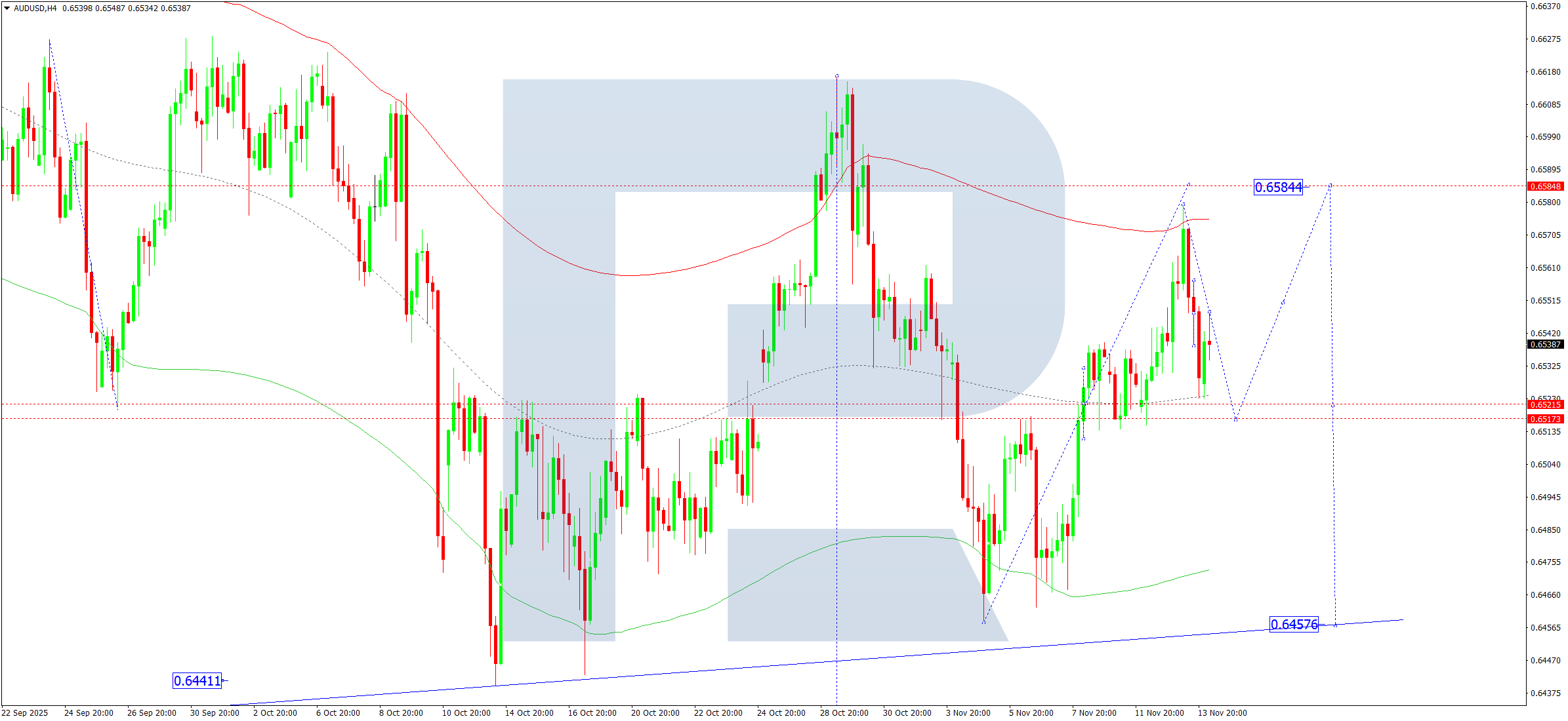 On the H4 chart of AUDUSD, the market completed a correction towards 0.6579. On 14 November 2025, a downward wave towards 0.6515 is expected, followed by an upward move towards 0.6545. The market will effectively outline a new consolidation range around 0.6555. A breakout upwards may extend the correction towards 0.6585. A breakout downwards would open the potential for the continuation of the trend towards 0.6454.
