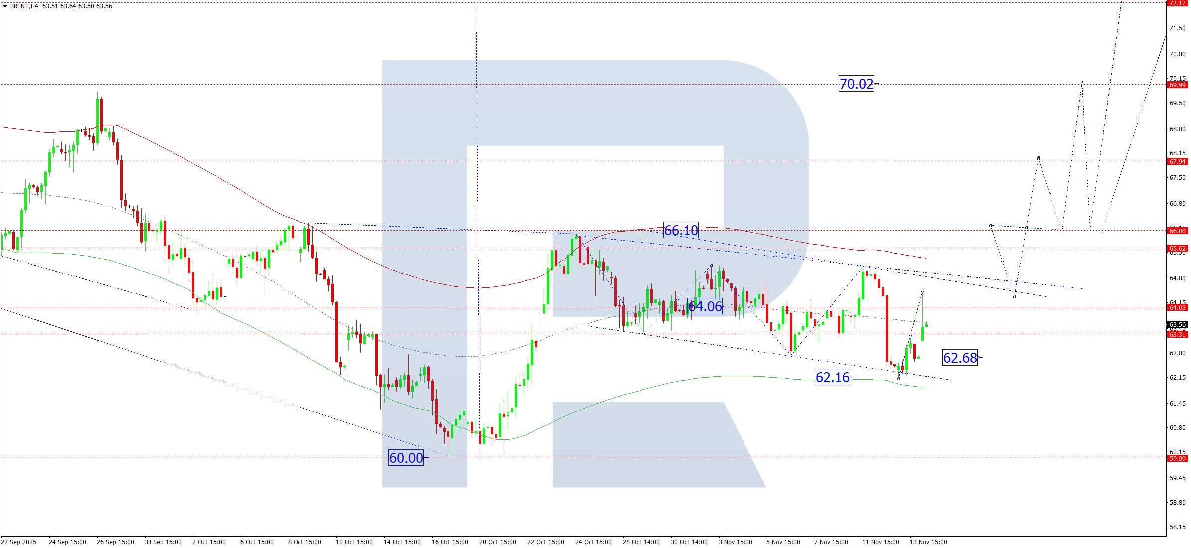 On the H4 chart of Brent crude, the market completed an upward impulse towards 64.44. On 14 November 2025, a corrective move towards 63.33 is possible. The market will effectively outline a new consolidation range. A breakout upwards opens the potential for the continuation of the upward wave towards 66.10. A breakout above 66.10 opens the potential for the trend to extend towards 70.00 as a local target.
