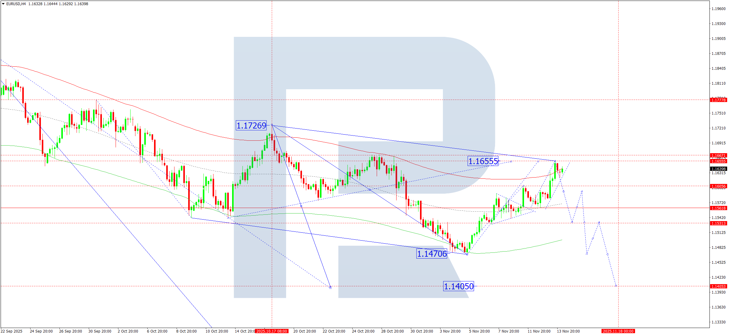 On the H4 chart of EURUSD, the market formed a narrow consolidation range around 1.1562 and broke upwards. On 14 November 2025, after receiving support at 1.1605, the market completed another corrective structure, reaching 1.1655. A downward impulse towards 1.1622 has formed, followed by a correction to 1.1644. A breakout downwards opens the potential for a continued decline towards 1.1533, with scope to extend the trend to 1.1405. If breaking upwards, the pair could reach the current correction high at 1.1666. Afterwards, the likely scenario is the beginning of a downward wave towards 1.1405.