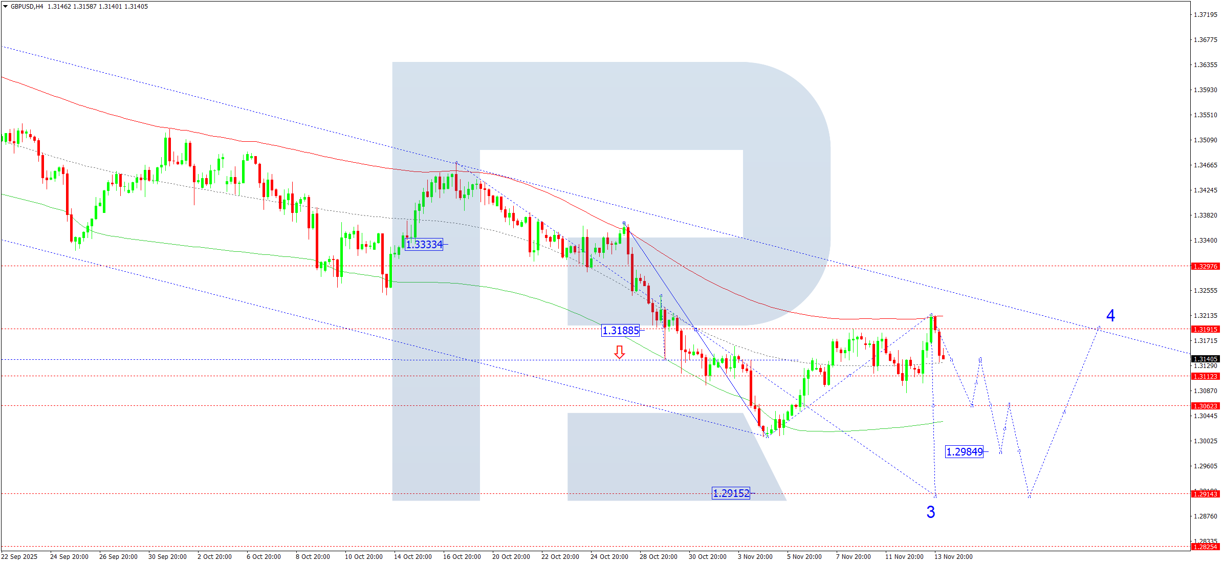 On the H4 chart of GBPUSD, the market completed a correction towards 1.3215. On 14 November 2025, the market is developing a downward impulse towards 1.3131. A breakout below this level would place the next target at 1.3065, with the potential to extend the trend to 1.2915. The target is local, within the third wave of the downtrend.