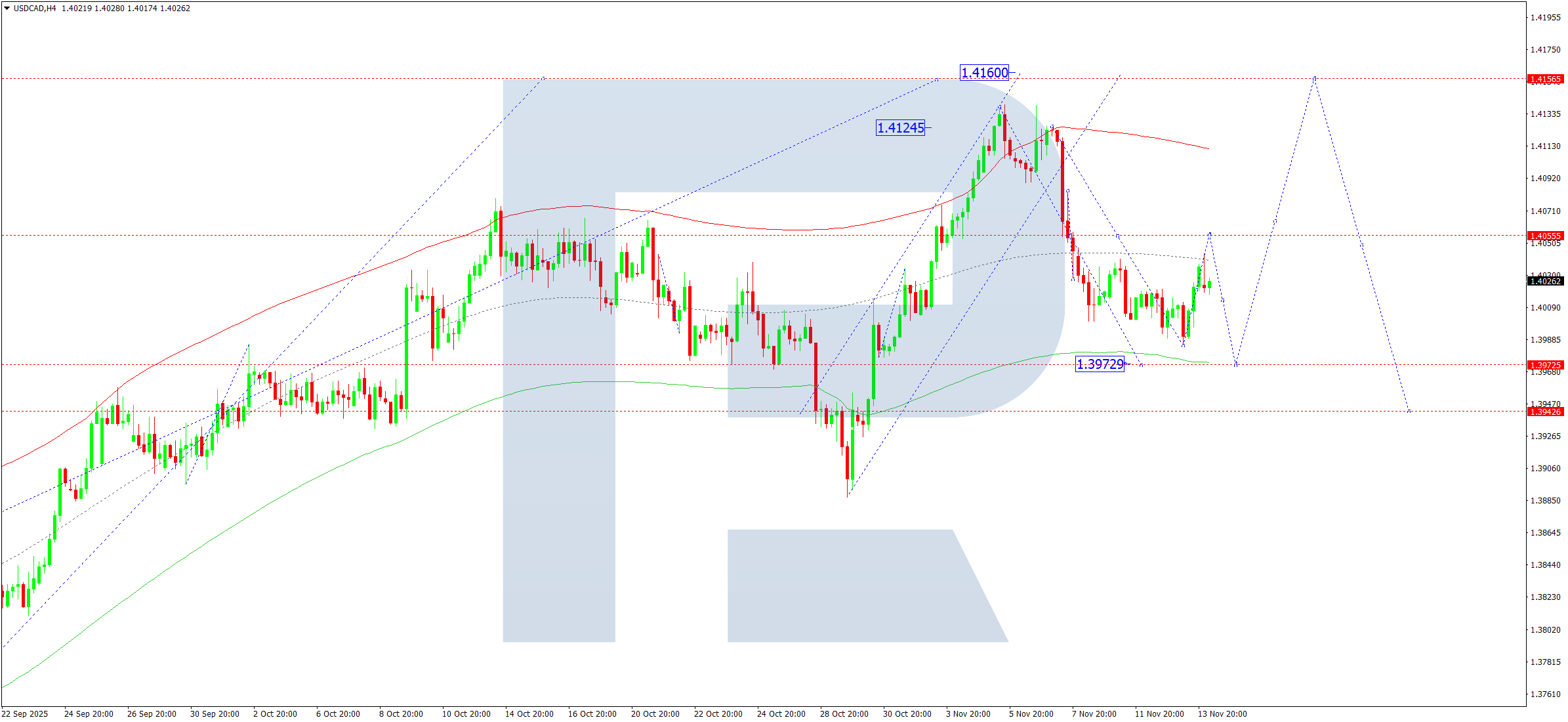On the H4 chart of USDCAD, the market completed a correction towards 1.3985. On 14 November 2025, an upward move towards 1.4055 is forming. Afterwards, another downward leg towards 1.3973 is possible. This level will fully exhaust the correction potential. Then an upward wave towards the local target of 1.4160 may begin.