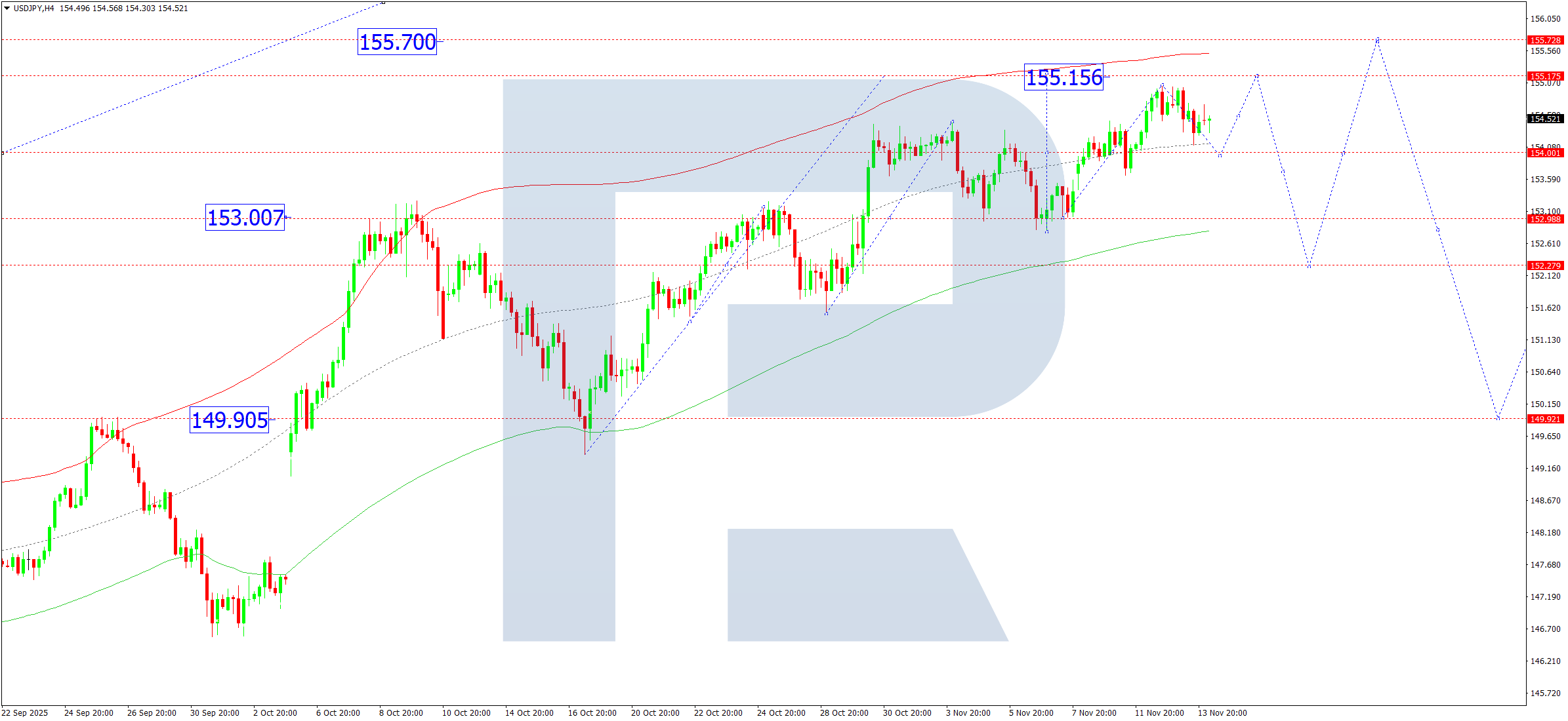On the H4 chart of USDJPY, the market continues to form a correction towards 154.00. On 14 November 2025, the correction may complete, followed by the beginning of an upward wave towards 155.15. The market will effectively outline a new consolidation range around 154.00. A breakout upwards opens the potential for the continuation of the upward wave towards 155.70, with an extension towards 157.57. The target is local and estimated. A breakout downwards may trigger a corrective move towards at least 152.22, followed by growth towards 155.70.