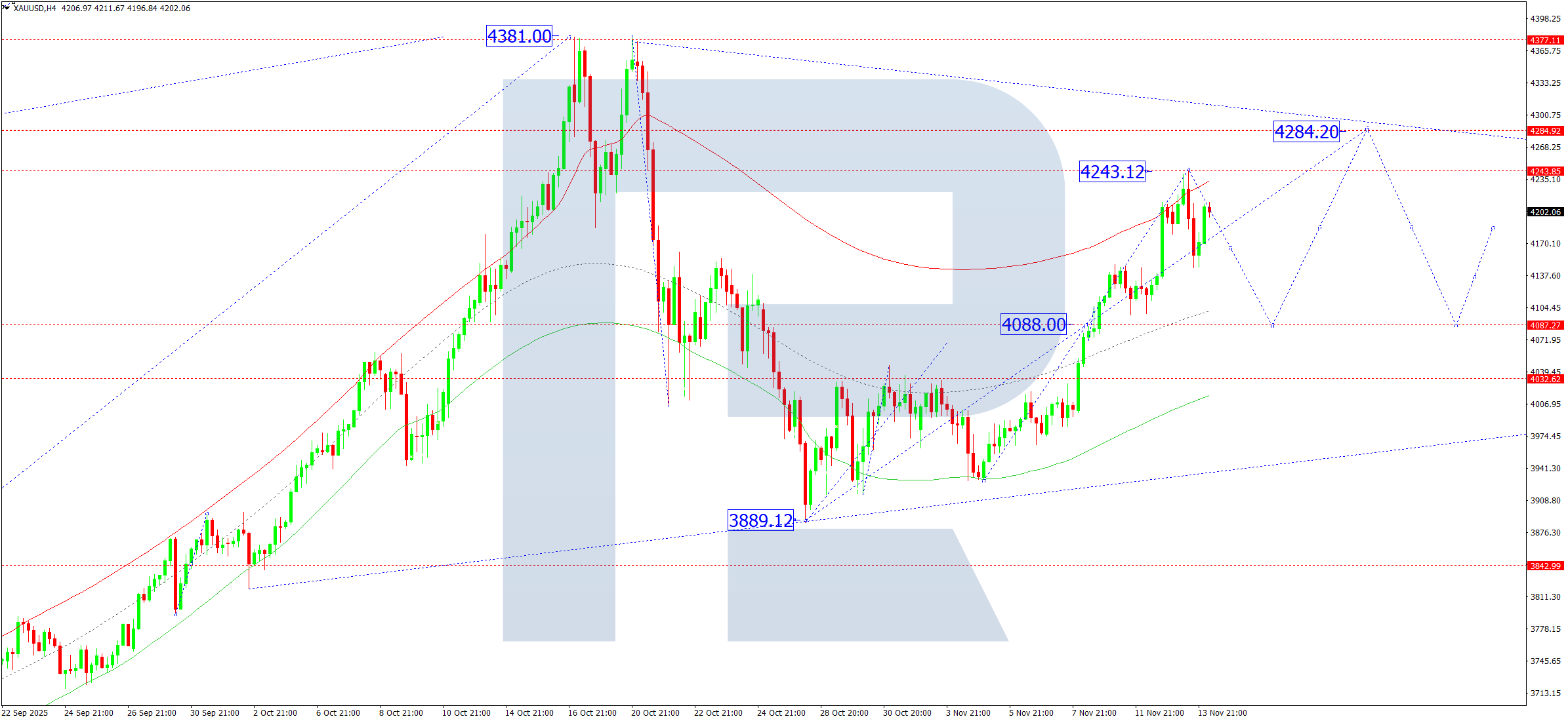 On the H4 chart of XAUUSD, the market completed a growth wave towards 4,243, a local target. On 14 November 2025, a consolidation range is expected to form below this level. A breakout downwards opens the potential for a decline towards 4,088. A breakout upwards suggests the extension of the growth wave towards 4,284.