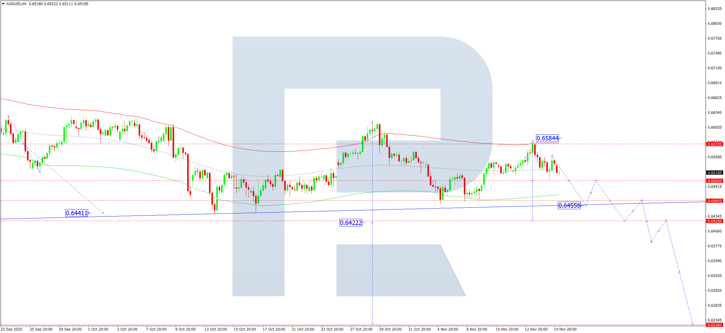On the H4 chart of AUDUSD, the market completed a downward wave towards 0.6503 and a correction towards 0.6549. On 17 November 2025, the outlook includes a downward wave towards 0.6500. A breakout below this level would open the door for a downward wave towards 0.6455, with the trend potentially extending towards 0.6422 as a local estimated target.