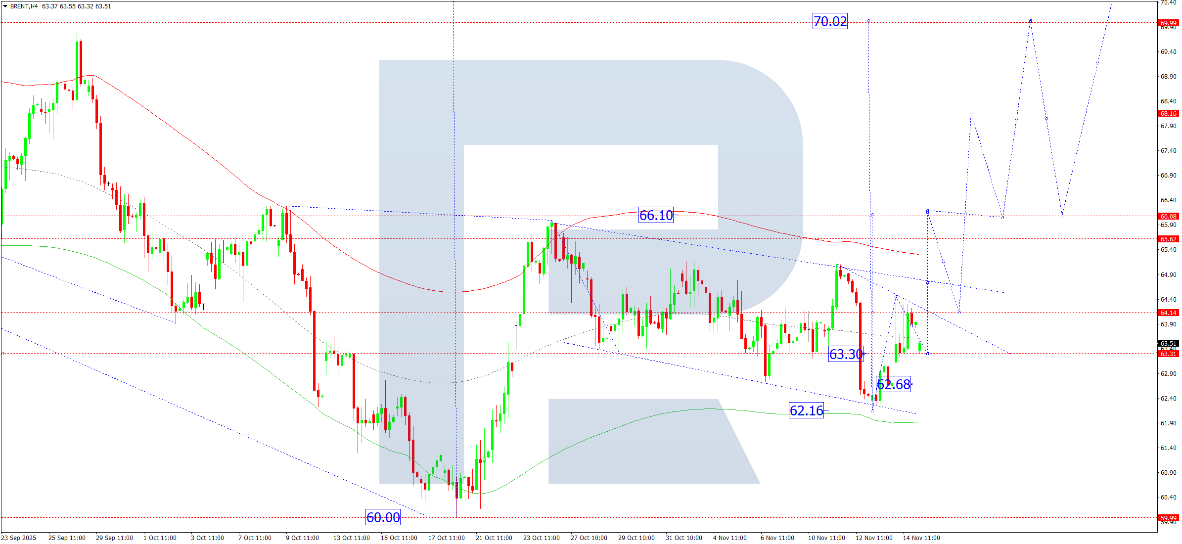 On the H4 chart of Brent crude, the market completed an upward impulse towards 64.30 and a correction towards 63.33. On 17 November 2025, the scenario includes an upward leg towards 64.70. The market will effectively outline a new consolidation range. A breakout above this range would open the way for a continued move towards 66.10. A breakout above 66.10 would open the potential for the trend to continue towards 70.00 as a local target.
