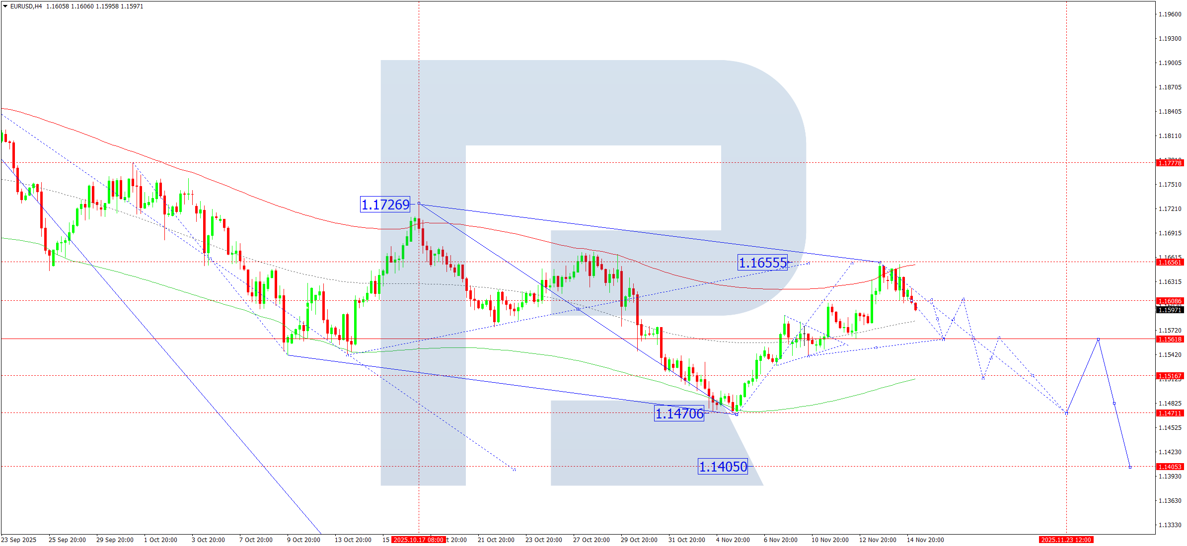 On the H4 chart of EURUSD, the market formed a narrow consolidation range around 1.1608 and broke out of the range downwards. On 17 November 2025, the market forms a downward impulse towards 1.1562 as the first target. Afterwards, this wave could correct towards 1.1606. Then the scenario suggests a continued downward movement towards 1.1515, with the potential to extend the trend towards 1.1405.