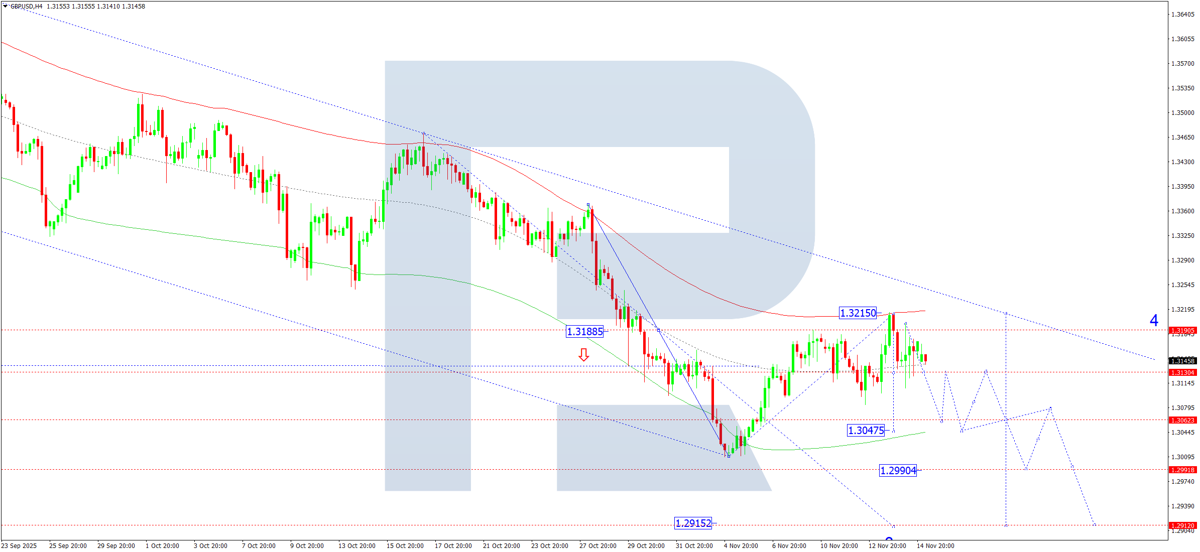 On the H4 chart of GBPUSD, the market completed a downward impulse towards 1.3107. On 17 November 2025, the market formed a correction towards 1.3190. Afterwards, the scenario includes a new downward impulse towards 1.3126. A breakout below this level would open the potential for a continuation of the wave towards 1.3047, with the potential to extend the trend towards 1.2915.