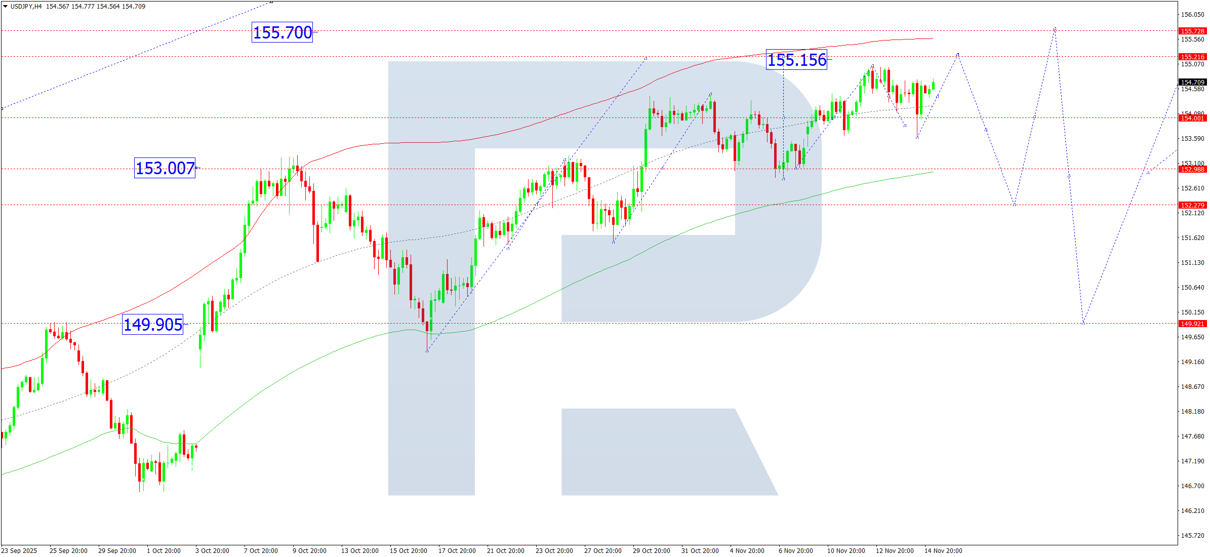 On the H4 chart of USDJPY, the market completed a correction towards 153.62 and continues to form an upward wave towards 155.15. On 17 November 2025, the price could reach this target level and then start a correction towards 153.00. Afterwards, an upward wave may begin, aiming for 155.70 as a local target.