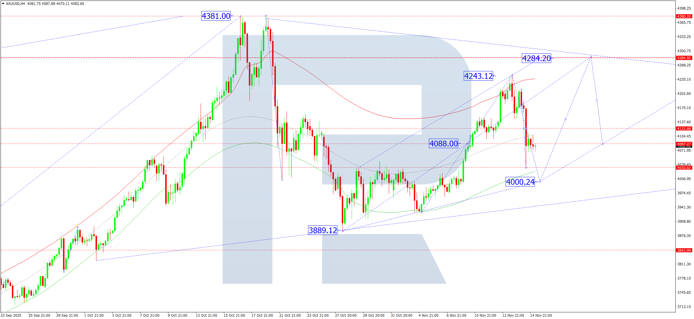 On the H4 chart of XAUUSD, the market completed a correction wave towards 4,032. On 17 November 2025, the scenario includes an upward move towards 4,122. In effect, the market may form a consolidation range around this level. A breakout downwards would pave the way for a downward wave towards 4,000. A breakout upwards could extend the upward wave towards 4,284.