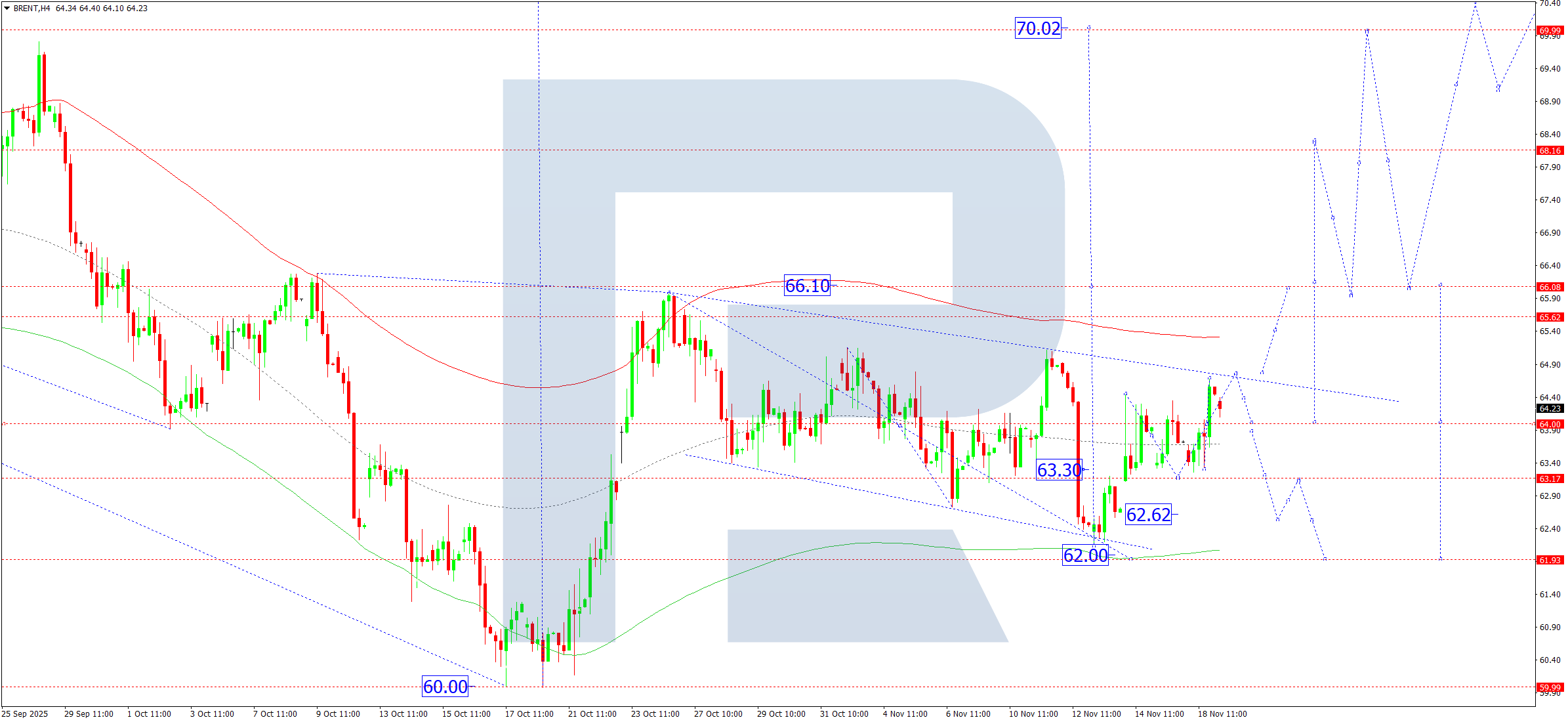 On the Brent H4 chart, the market forms a consolidation range above 64.00. On 19 November 2025, the range could expand upwards to 64.75. A breakout upwards from the range opens the potential for the continuation of the rising wave towards 66.10, with the potential to develop the wave towards 70.00. A breakout downwards from the range keeps open the possibility of another downward corrective move towards 62.00. After this correction completes, a rise towards 70.00 remains possible.