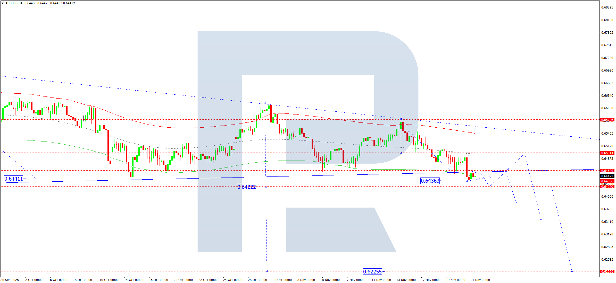 On the H4 chart of AUDUSD, the market reached the local target of the downward wave at 0.6436. On 21 November 2025, the market is forming a consolidation range above this level. If the price breaks upwards, the market may form a corrective move towards 0.6500 (testing from below). Afterwards, the market may decline towards 0.6422 as a local target. A downward breakout would open the way for a wave towards 0.6422 with the potential to extend the trend towards 0.6222.
