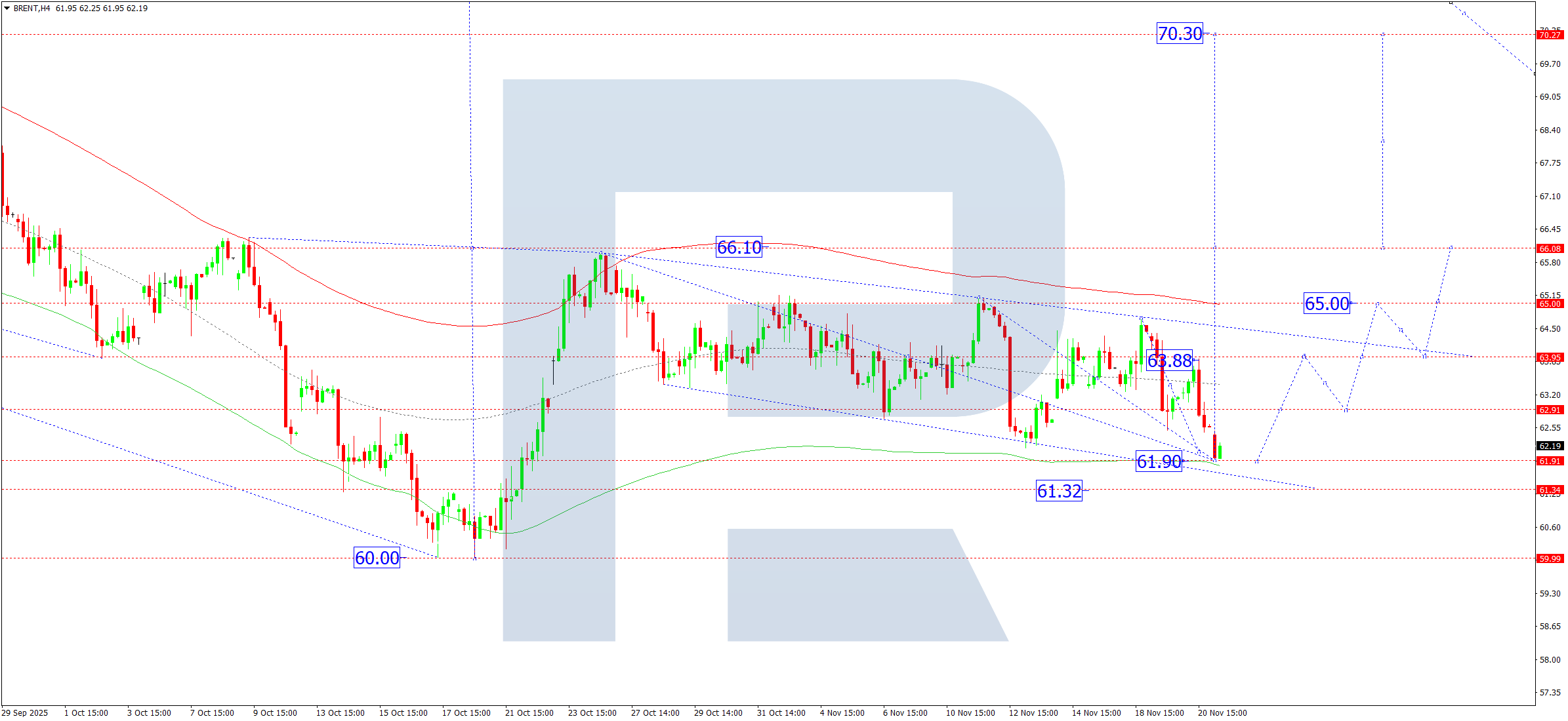 On the H4 chart of Brent crude, the market completed a downward wave towards 61.90 and forms a consolidation range above this level. On 21 November 2025, if the price breaks upwards out of the range, the market opens the potential for a continued upward momentum towards 66.10, with the potential to extend the wave towards 70.30. If the price breaks downwards from the range, the market may form another corrective leg towards 61.85. After this correction ends, a rise towards 70.30 remains possible.