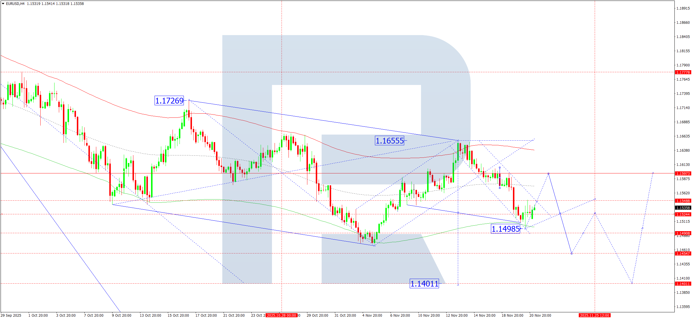 On the H4 chart of EURUSD, the market completed a downward wave towards 1.1499. On 21 November 2025, the market forms a compact consolidation range above this level. An upward breakout out of this range would open the door for a correction towards 1.1588. If the price breaks downwards, the market opens the potential for the third wave to continue along the downtrend towards 1.1400.