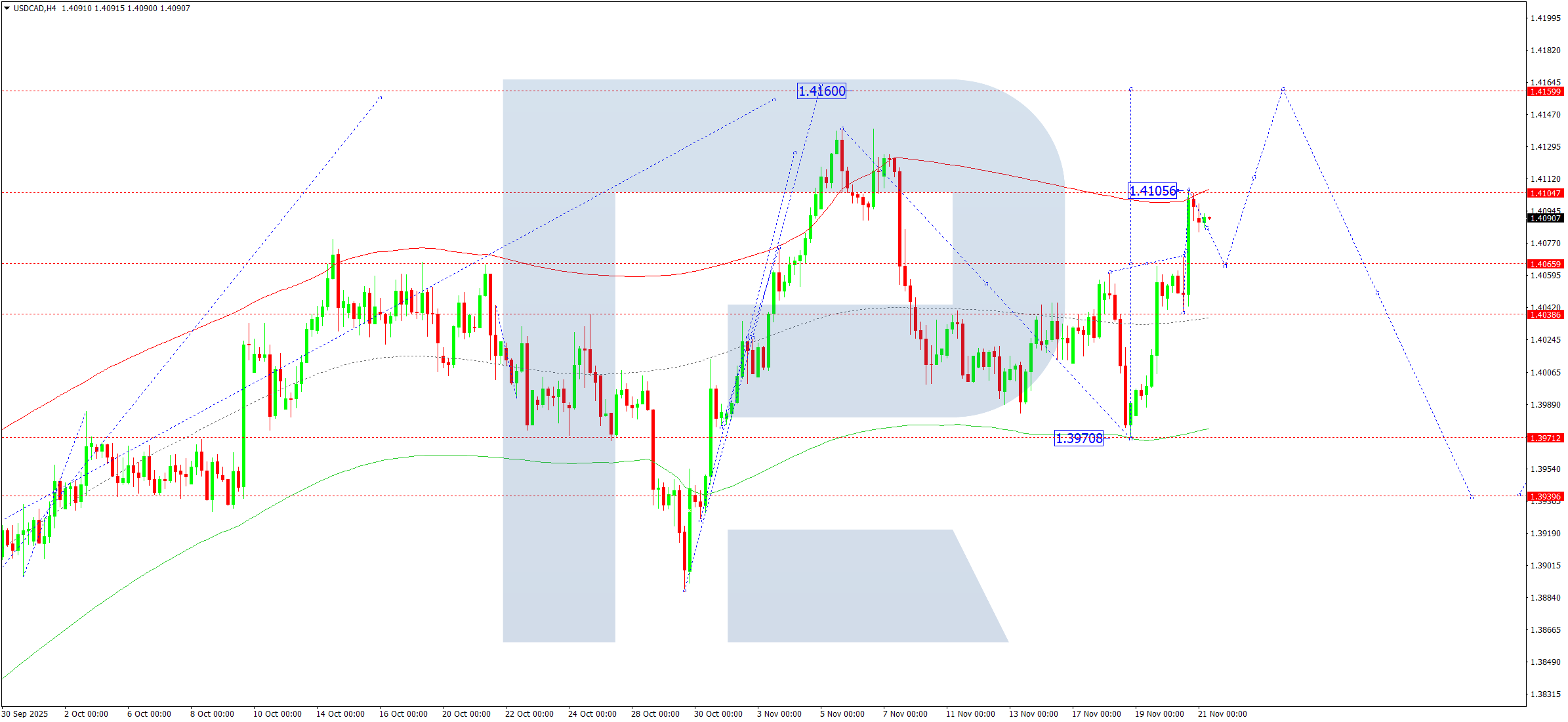 On the H4 chart of USDCAD, the market completed an upward wave towards 1.4106. On 21 November 2025, the market may form a compact consolidation range below this level. If the price breaks downwards from the range, a corrective move towards 1.4070 remains possible. An upward breakout would open the way for an upward wave towards 1.4160 as a local target.