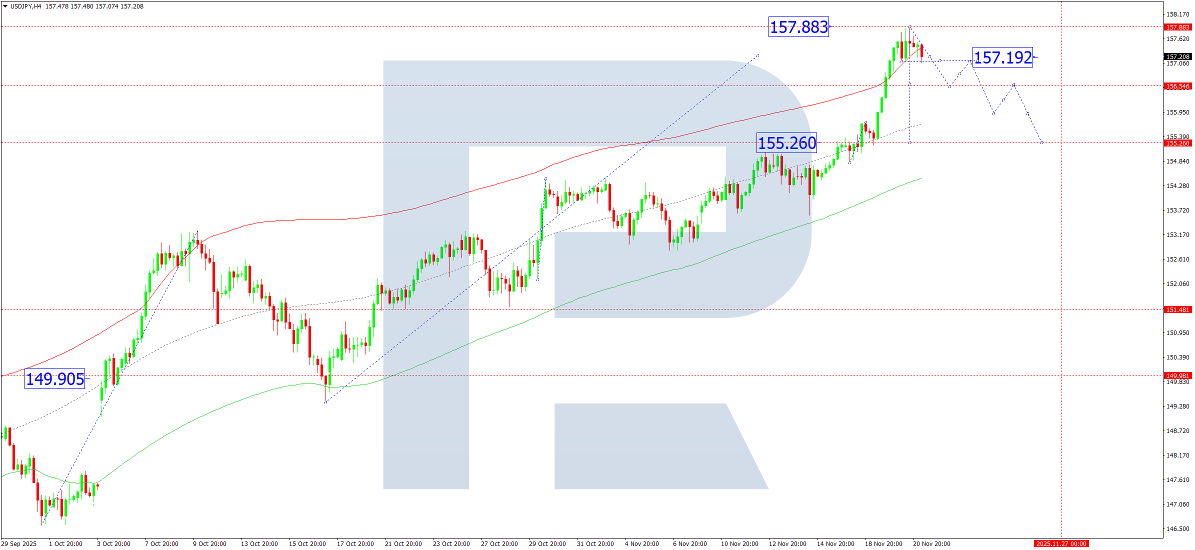 On the H4 chart of USDJPY, the market completed an upward wave towards 157.88. On 21 November 2025, the market may form a compact consolidation range below this level. If the price breaks downwards from the range, the scenario includes the beginning of a correction towards 156.56 at least. If the price breaks upwards, the wave may extend towards 158.00.