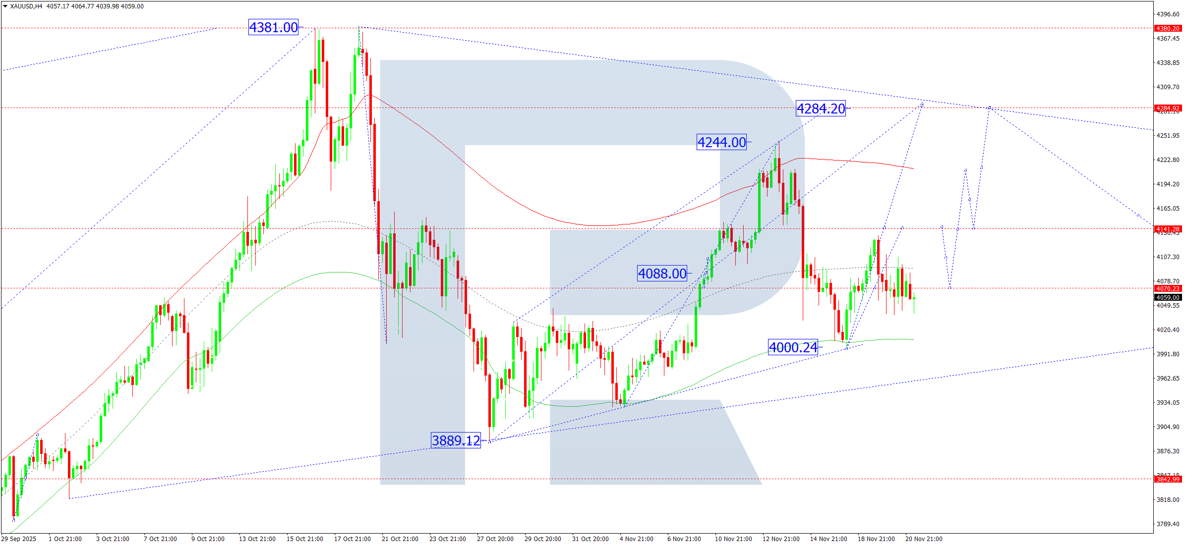 On the H4 chart of XAUUSD, the market is forming a consolidation range around 4,088 without a clear directional trend. On 21 November 2025, the market may continue the upward impulse towards 4,141 as the first target within the structure of the upward wave towards 4,284.