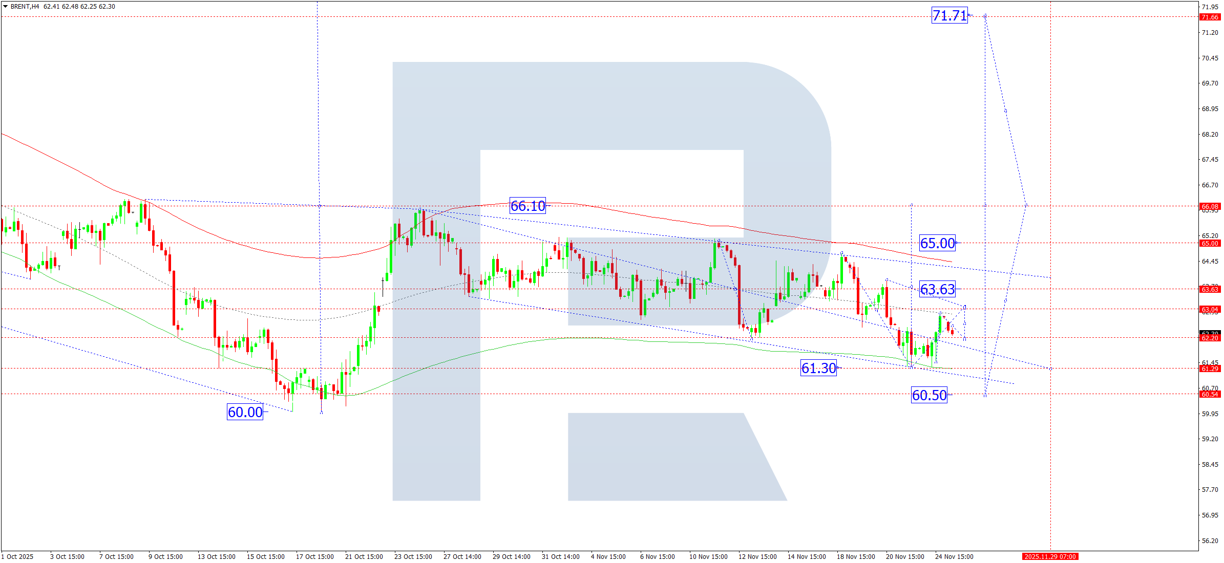 On the Brent H4 chart, the market forms a consolidation range around 62.62. On 25 November 2025, an upward breakout from this range would open the potential for continued upward movement towards 66.10, with the wave possibly extending towards 71.71. Conversely, if the price breaks downwards from the range, another downward corrective move towards 60.50 remains possible. After this correction completes, a rise towards 65.00 may follow.