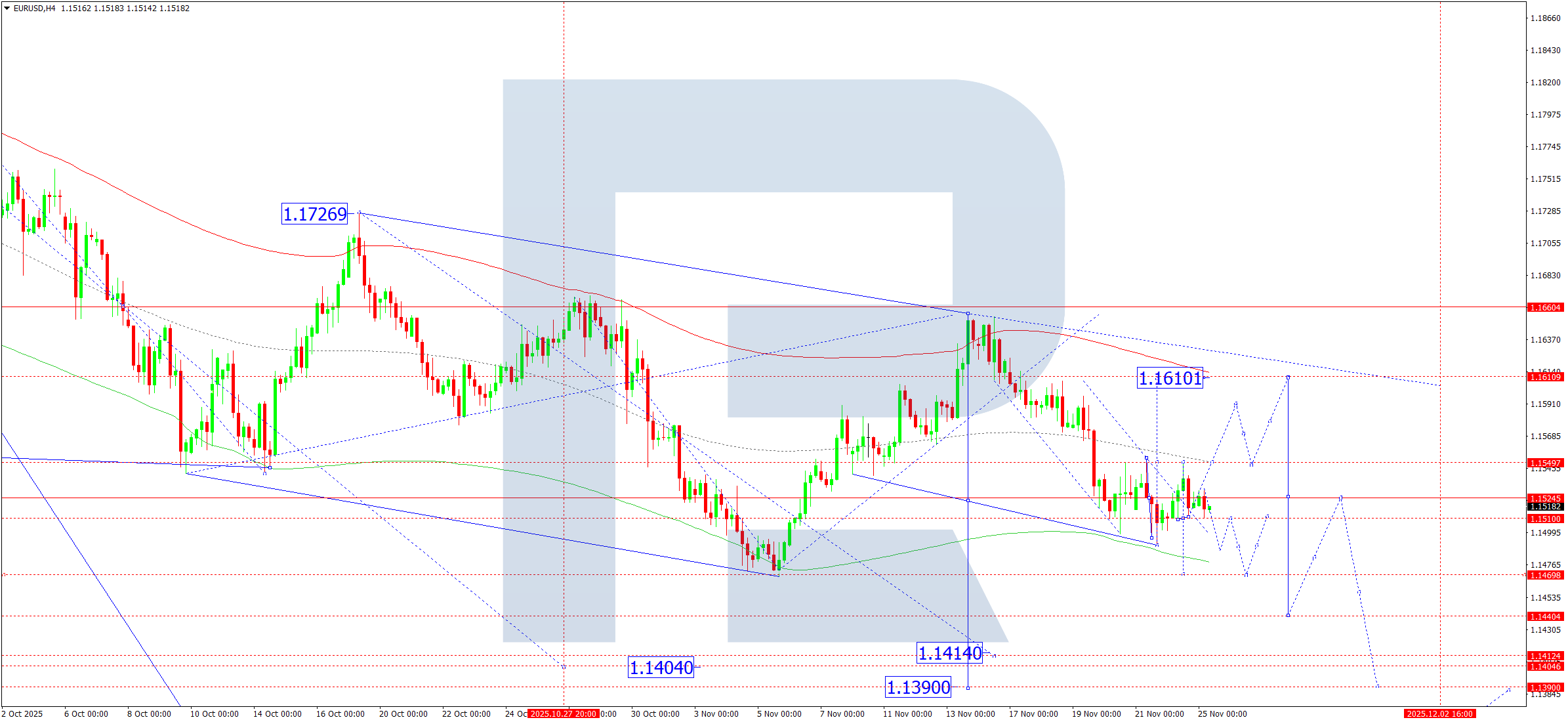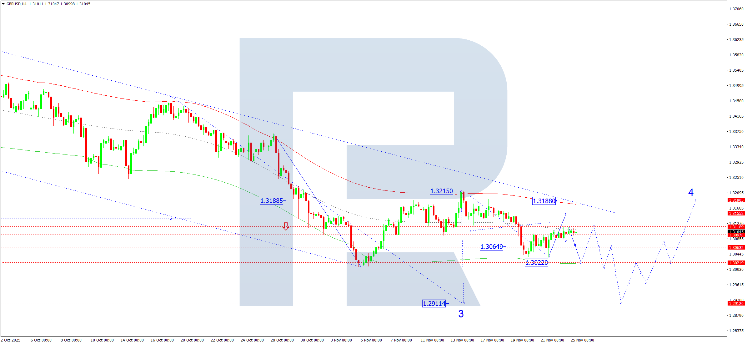 On the XAUUSD H4 chart, the market has completed an upward wave towards 4,141 and is forming a consolidation range around this level. On 25 November 2025, an upward breakout from this range becomes possible, with a target at 4,244. Afterwards, a correction towards 4,141 (tesing from above) may follow, and then a rise towards 4,285.