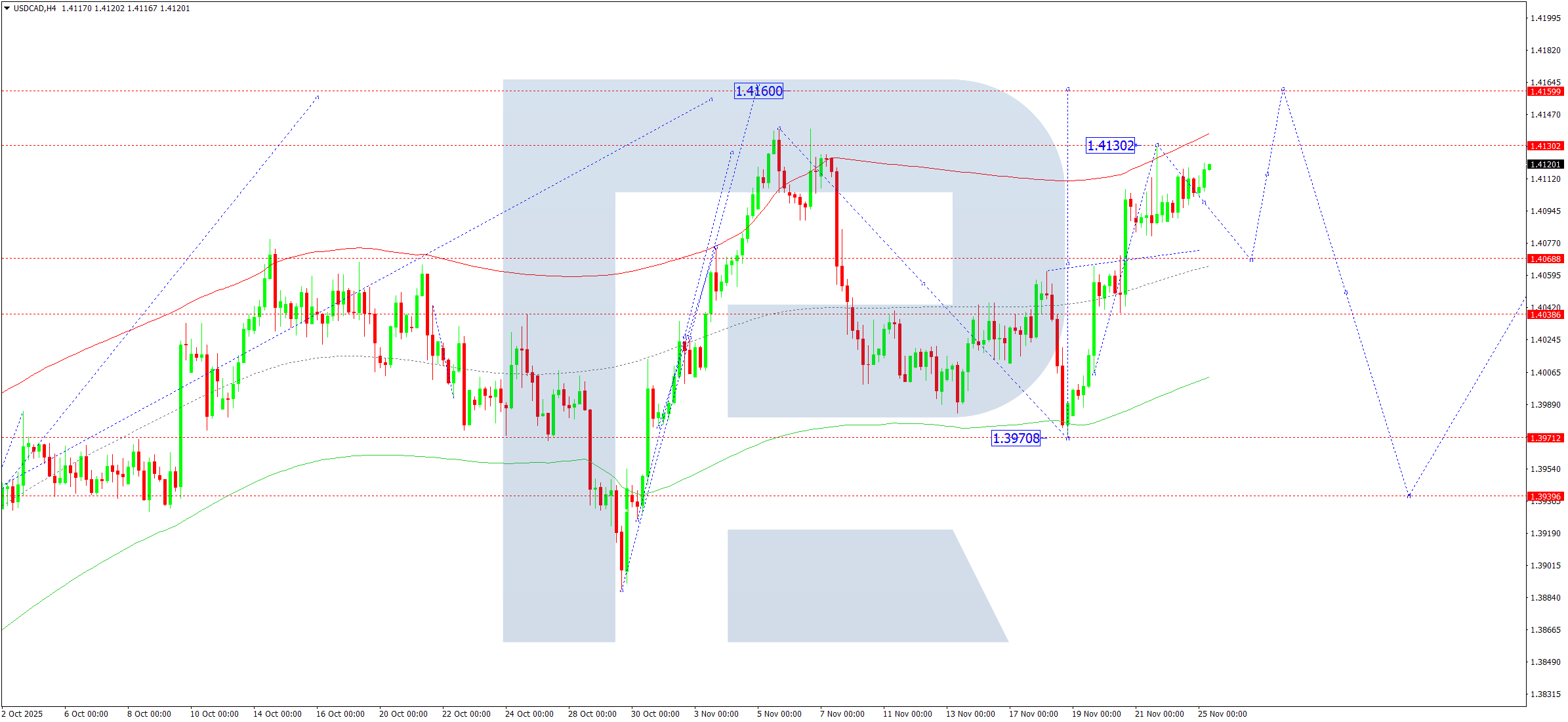 On the USDCAD H4 chart, the market continues to develop a consolidation range around 1.4100. On 25 November 2025, if the price breaks downwards from this range, a corrective move towards 1.4070 remains possible. An upward breakout could open the door for an upward wave towards 1.4160 as a local target.