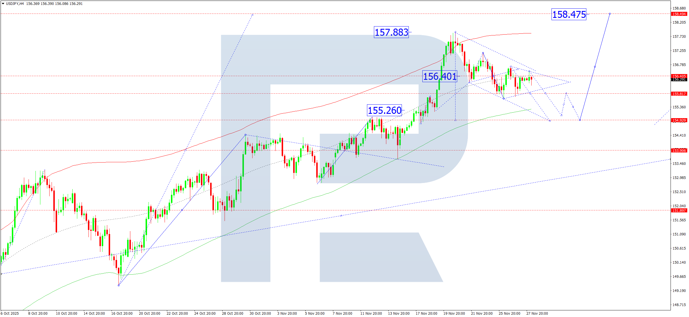 On the H4 chart of USDJPY, the market continues to develop a consolidation range around 156.40. On 28 November 2025, a downward leg towards 154.90 remains possible. This move will complete the ongoing correction. Once the correction ends, the market may begin a new upward wave towards 158.47 at a minimum.