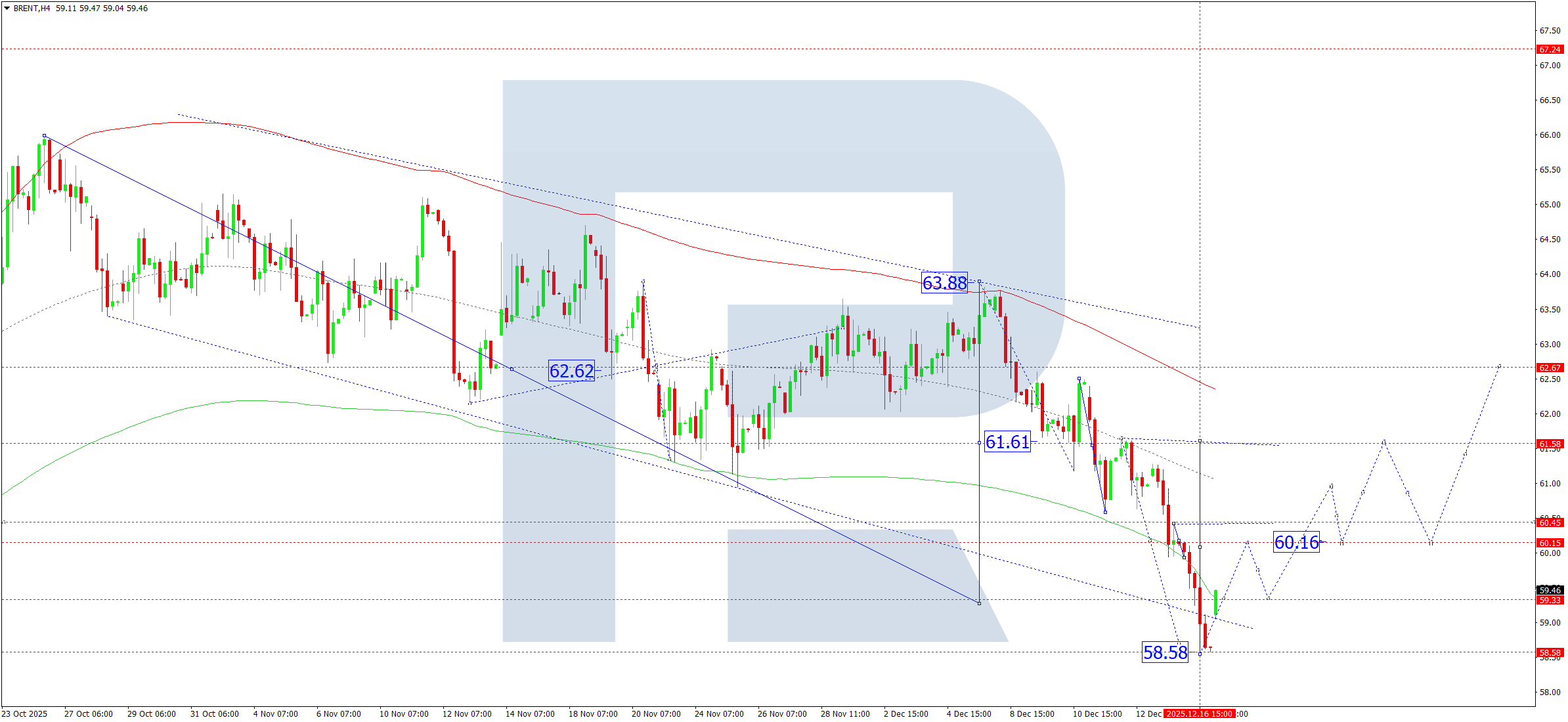 On the H4 chart of Brent crude, the market has completed a downward wave to the 58.58 level. Today, 17 December 2025, an upward impulse is forming towards 60.16. Later, we will consider the probability of a decline towards 59.40. After that, we expect growth towards 61.00 with the potential for the trend to continue towards 61.61. This is the first target.