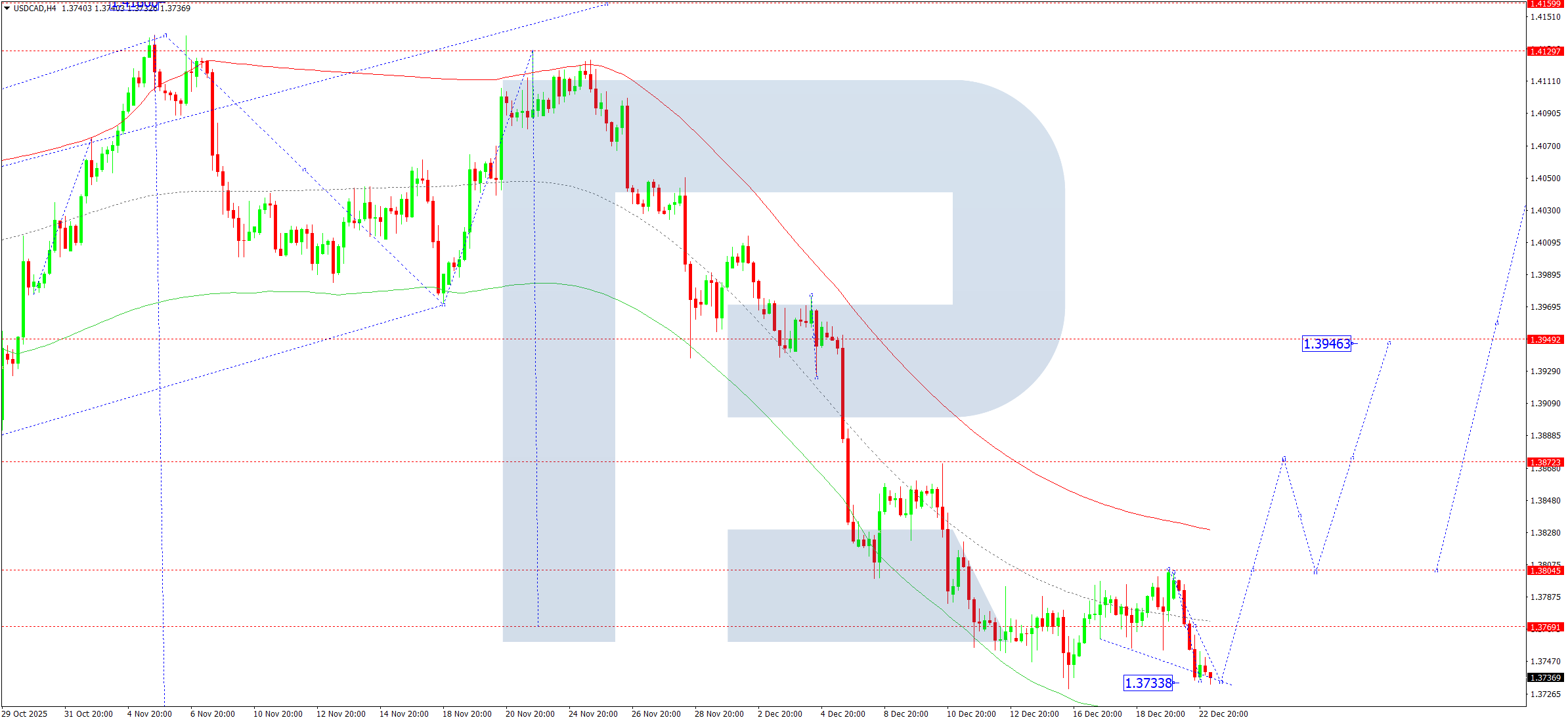 On the H4 chart of USDCAD, the market continues forming a consolidation range around the 1.3770 level. Today, 23 December 2025, we expect the range to expand downwards towards 1.3733. After that, we will consider the probability of a new upward wave towards 1.3805. If this level is broken, the wave may continue towards 1.3873.