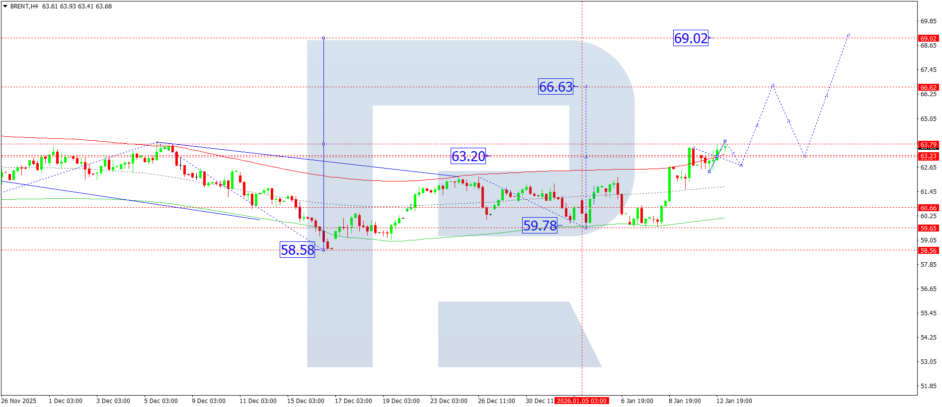 On the Brent H4 chart, the market has completed an upward wave to the 63.80 level. Today, 13 January 2026, a corrective leg to 63.00 and the development of a consolidation range around these levels are expected. A breakout below the range could extend the correction to the 61.70 level. Conversely, an upward breakout would open the potential for an upward wave towards the 66.66 level.