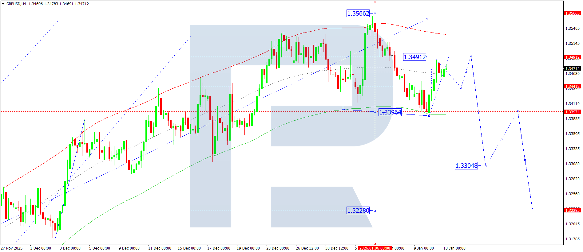 On the EURUSD H4 chart, the market continues to develop a correction of the second downward impulse. Today, 13 January 2026, a downward structure is forming towards the 1.1636 level. Further growth to 1.1704 cannot be ruled out. At this point, the corrective potential will be exhausted. After the correction is complete, a new downward impulse is expected to begin, aiming for the 1.1555 level as the first target.